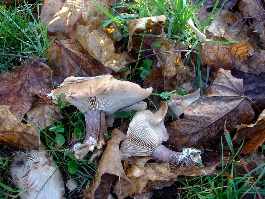 als ich wieder mal am Nachtmittag, des heutigen Tages mit unseren Hunden spazieren ging, entdeckte ich plötzlich in unserer Birkenallee auf der Wiese mit einer tollen Birkenreihe (die Straße wo ich schon sehr viele tolle Pilzfunde hatte und für mich nun die Pilzwunderstraße ist) zwei beige-bräunliche Gebilde im Boden und ich ging näher dahin weil meine Neugierde zu groß war und sah das es zwei Pilze waren. Ich drehte beide vorsichtig raus und sah, das beide ein bläulich-lila Stiel hatten. Und meine Freude war riesengroß, da es für mich die Lilastieligen Rötelritterlinge (Lepista saeva syn. Lepista personata) sind.