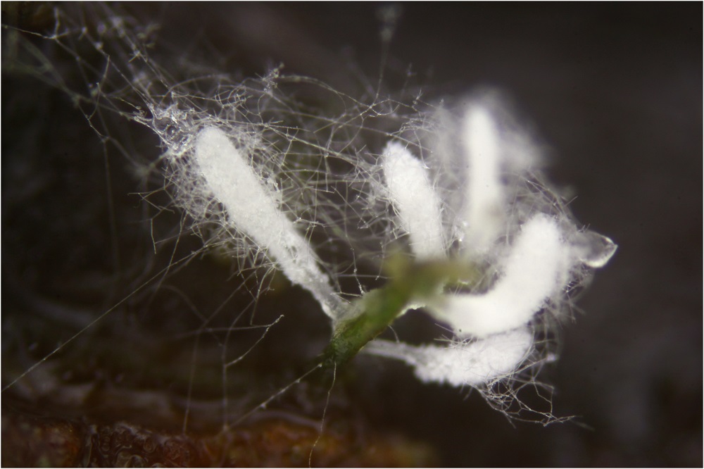 Der Pilz wuchs auf einem Zapfen von der Waldkiefer (Pinus sylvestris) und wurde noch nicht bearbeitet.