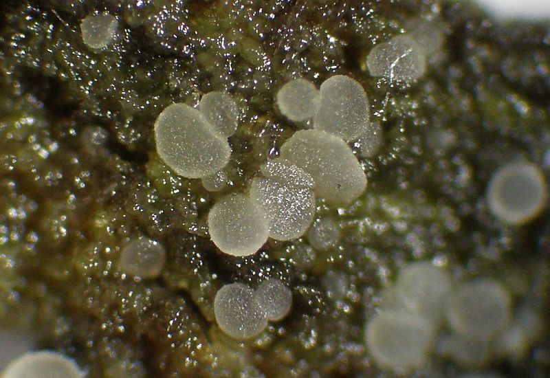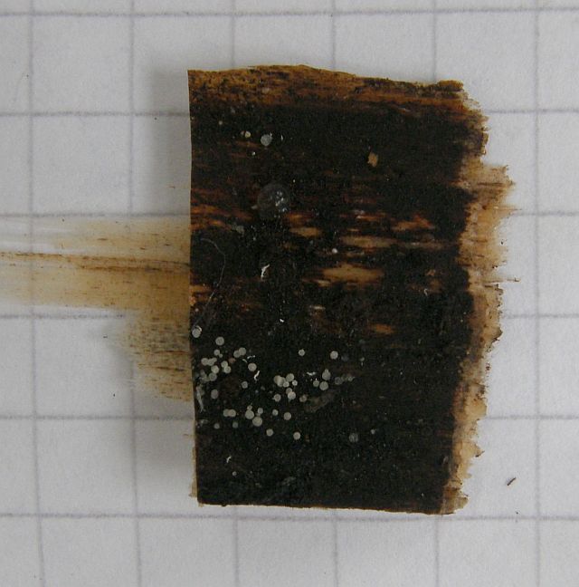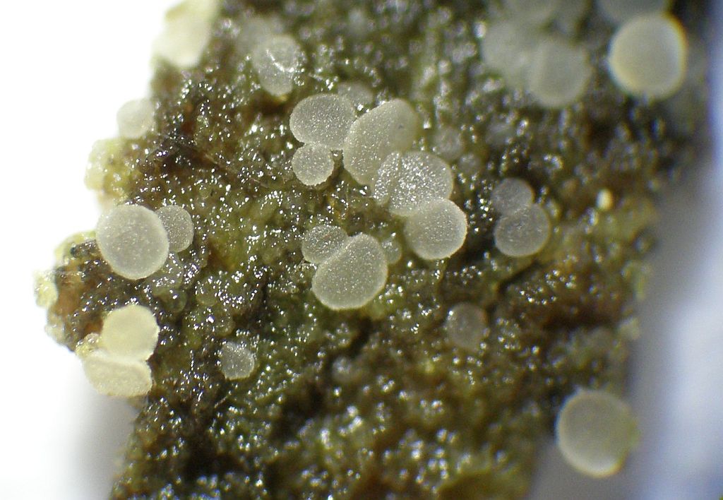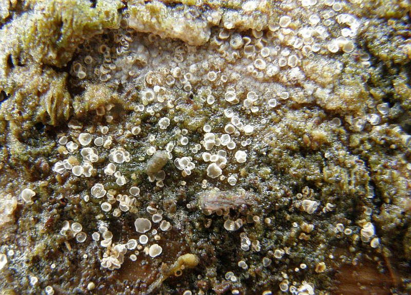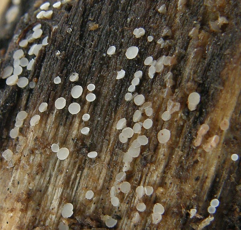 Die Schnittfläche war ja schier vollgetackert mit den gelben Becherchen, die ich im Grunde wegen der unregelmäßigen Form mit den welligen Rändern schon als Bisporella subpallida (Blassgelbes Sonnenbecherchen) hätte erkennen müssen.