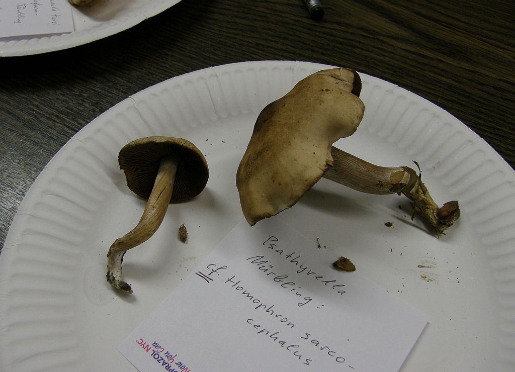 OK, in dem Fall stelle ich auch einfach mal die Bilder von mir ein. Den Pilz (sind doch zwei Fruchtkörper, hatte ich vergessen) hat im letzten Herbst jemand zu einem Fachtreffen des MAK mitgebracht und ich habe den mal zur mikroskopischen Untersuchung mitgenommen. Ich sage jetzt einfach mal: Es ist Homophron sarcocephalus (= Psathyrella spadicea).