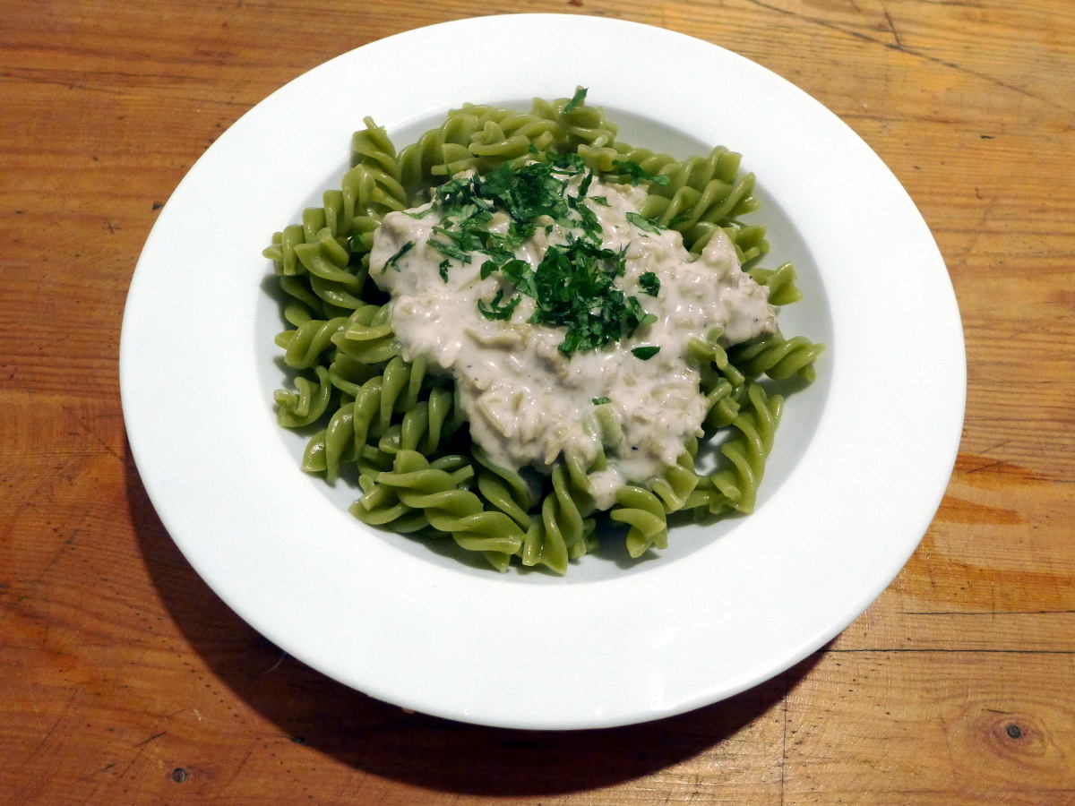 Glucken und Morcheln kommen eigentlich nur in Sahnesoße richtig zur Geltung, finde ich. Sahne habe ich allerdings nicht oft im Haus, so dass ich mal die vegane Variante ausprobiert habe.