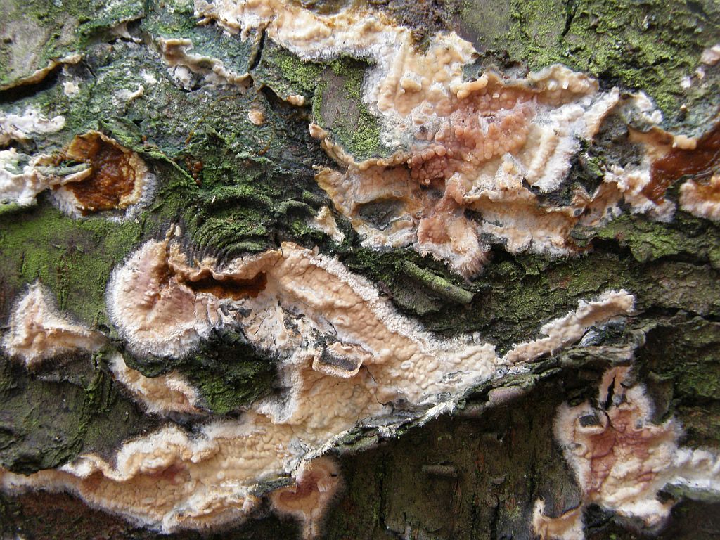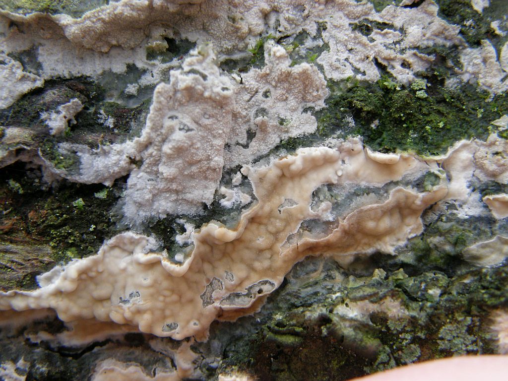 Da schiebt sich ein recht bunt geratener (Kriegsbemalung?) Cylindrobasidium laeve (Ablösender Rindenpilz) auf die Hyphoderma. Ratsch. Einmal nicht aufgepasst, hat man zack! einen Cylindrobasidium im Nacken.