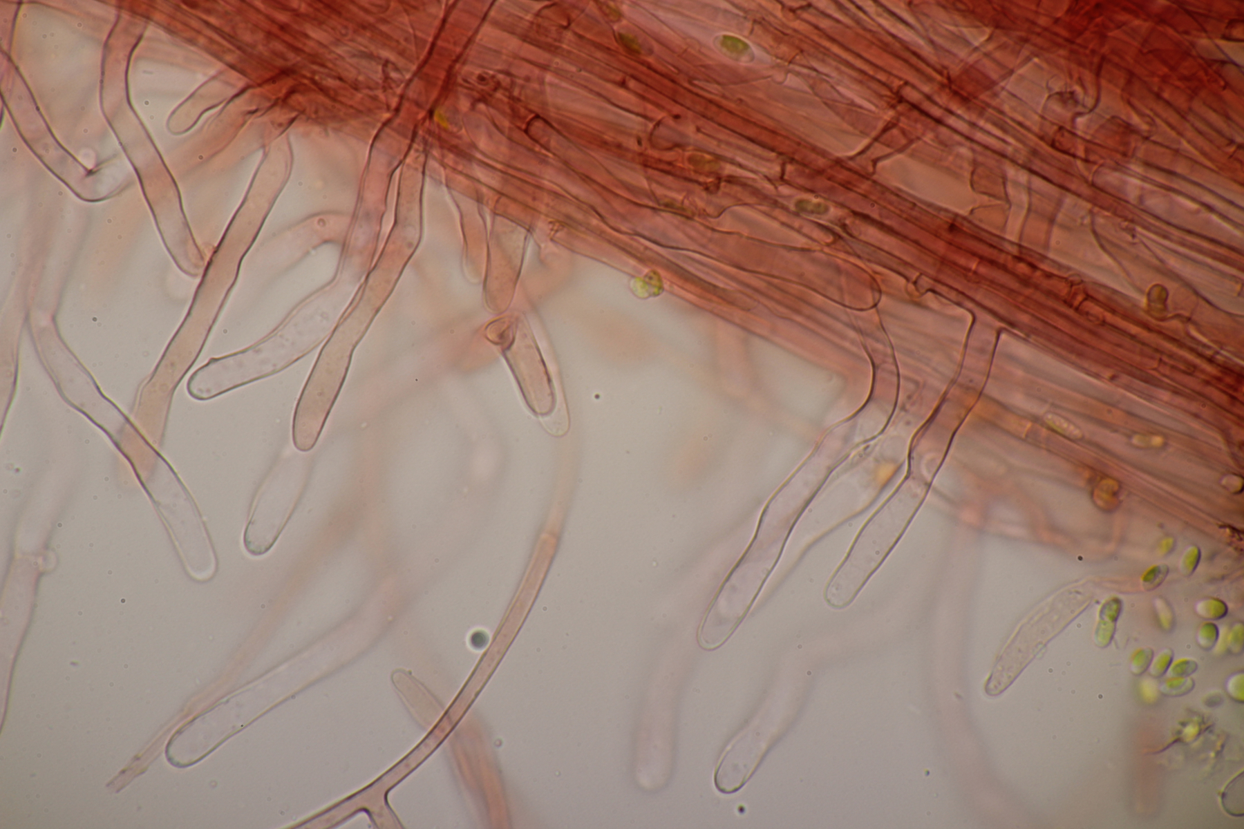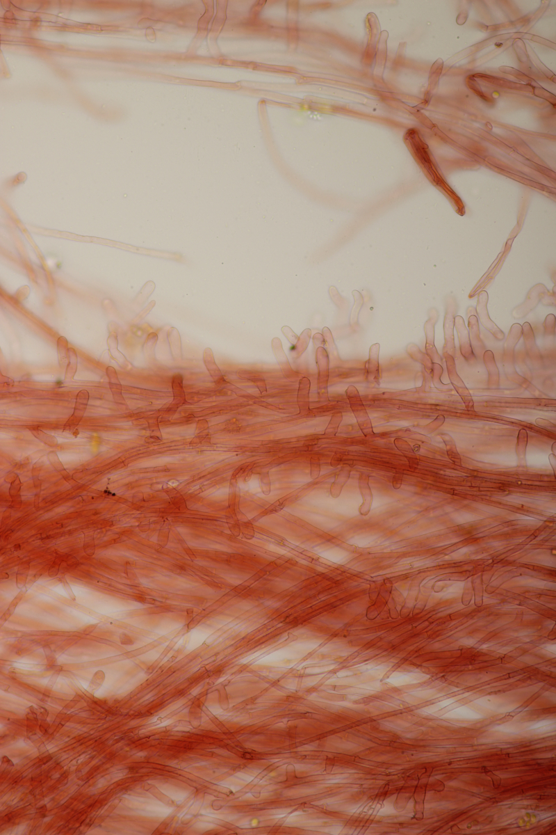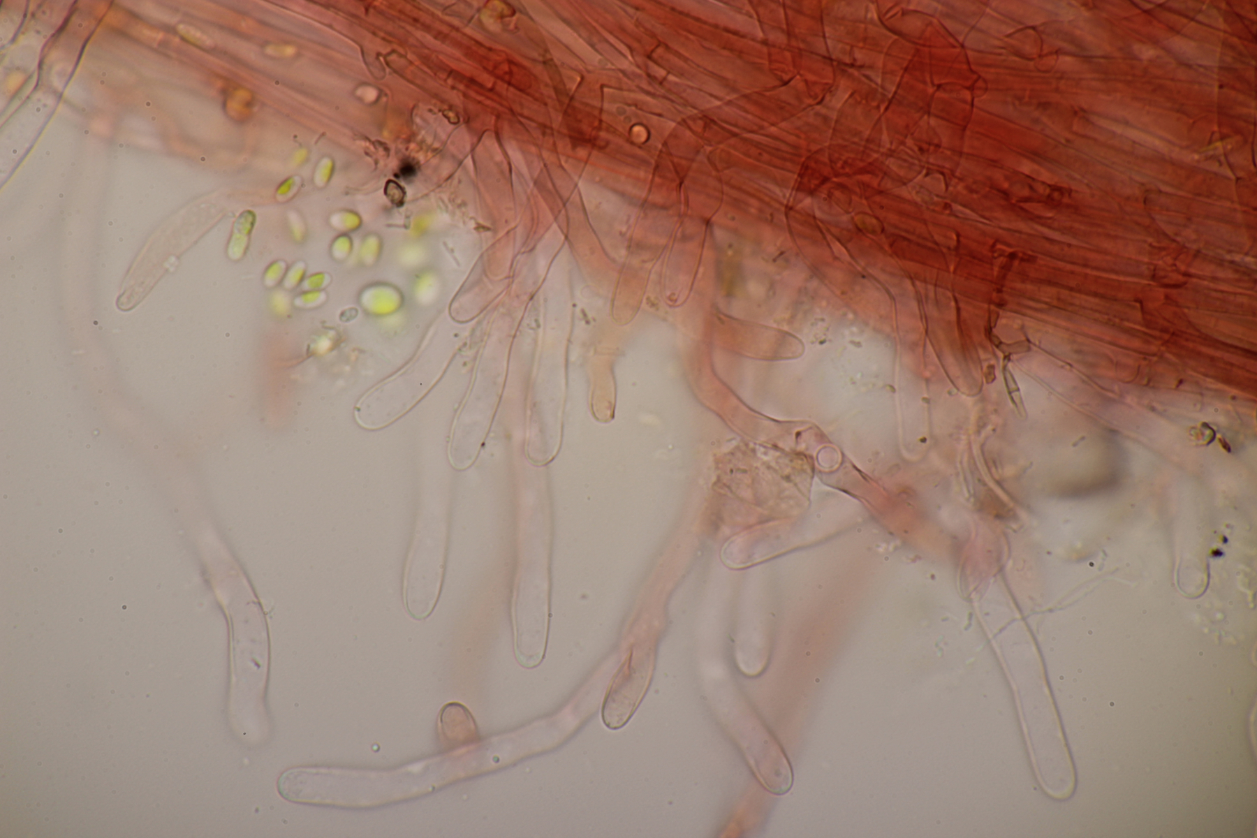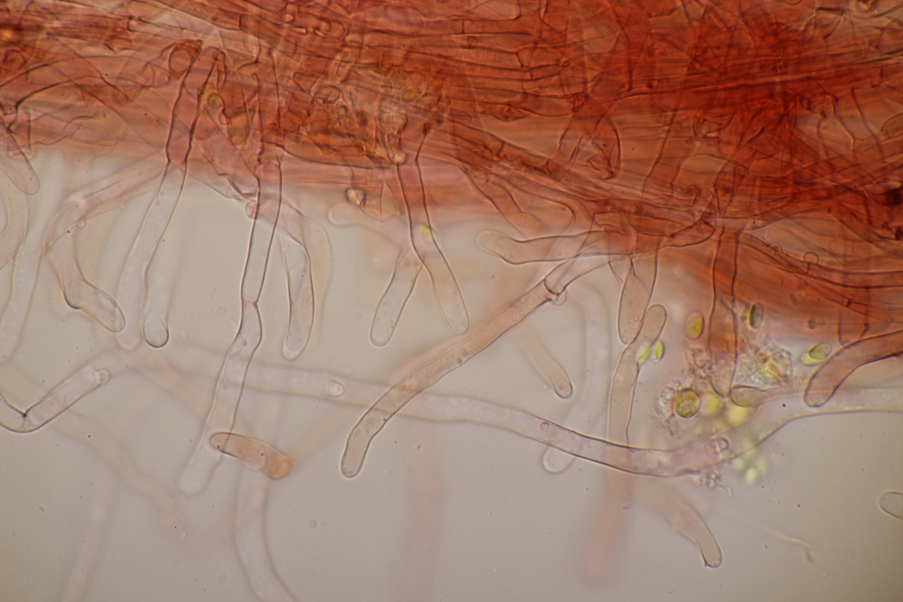Sporen: Sporenpulver weiß; Sporen elliptisch, meist eher schmal, nach eigenen Messungen 7-10 x 4,5-6 (wohl aber wie bei allen Arten der Gruppe recht variabel), glatt, dünnwandig, inamyloid; Basidien überwiegend 4-sporig; Schnallen vorhanden; Hymenialzystiden fehlen; Stiel mit langen zylindrischen Haaren (im Grunde wohl nur abstehende Endzellen der Hyphen).