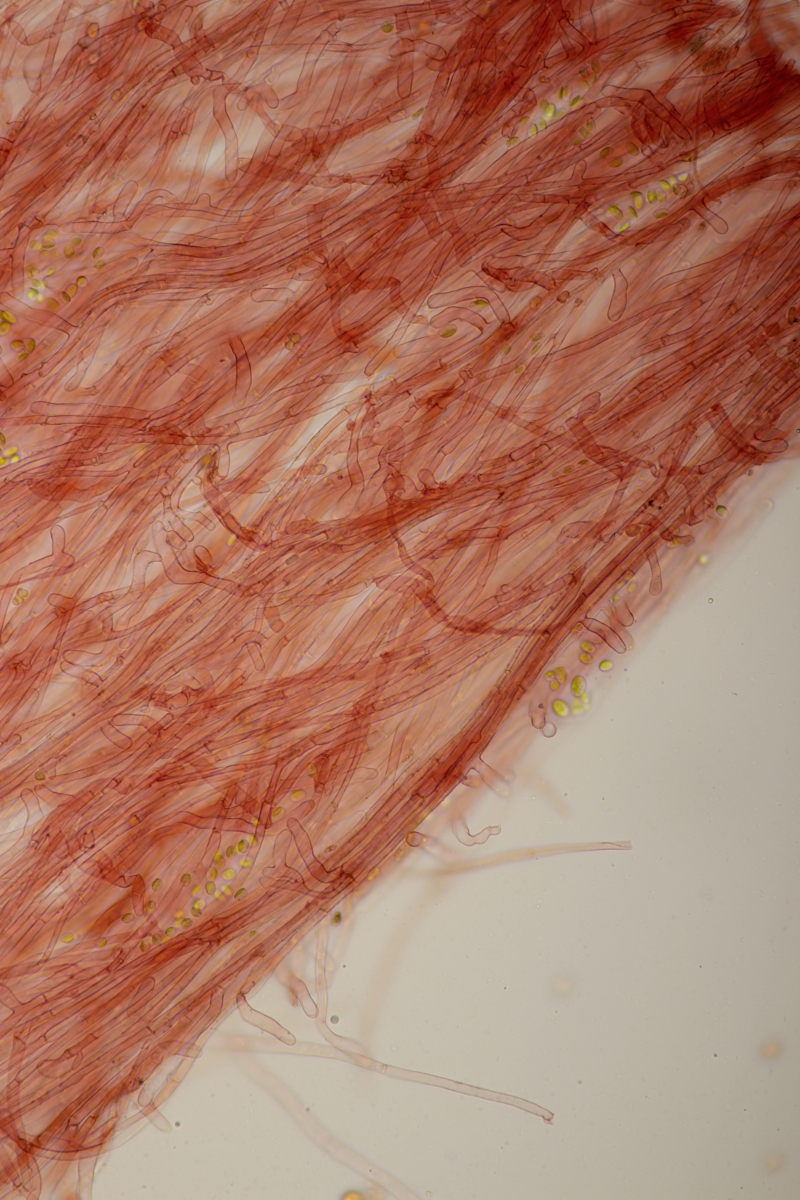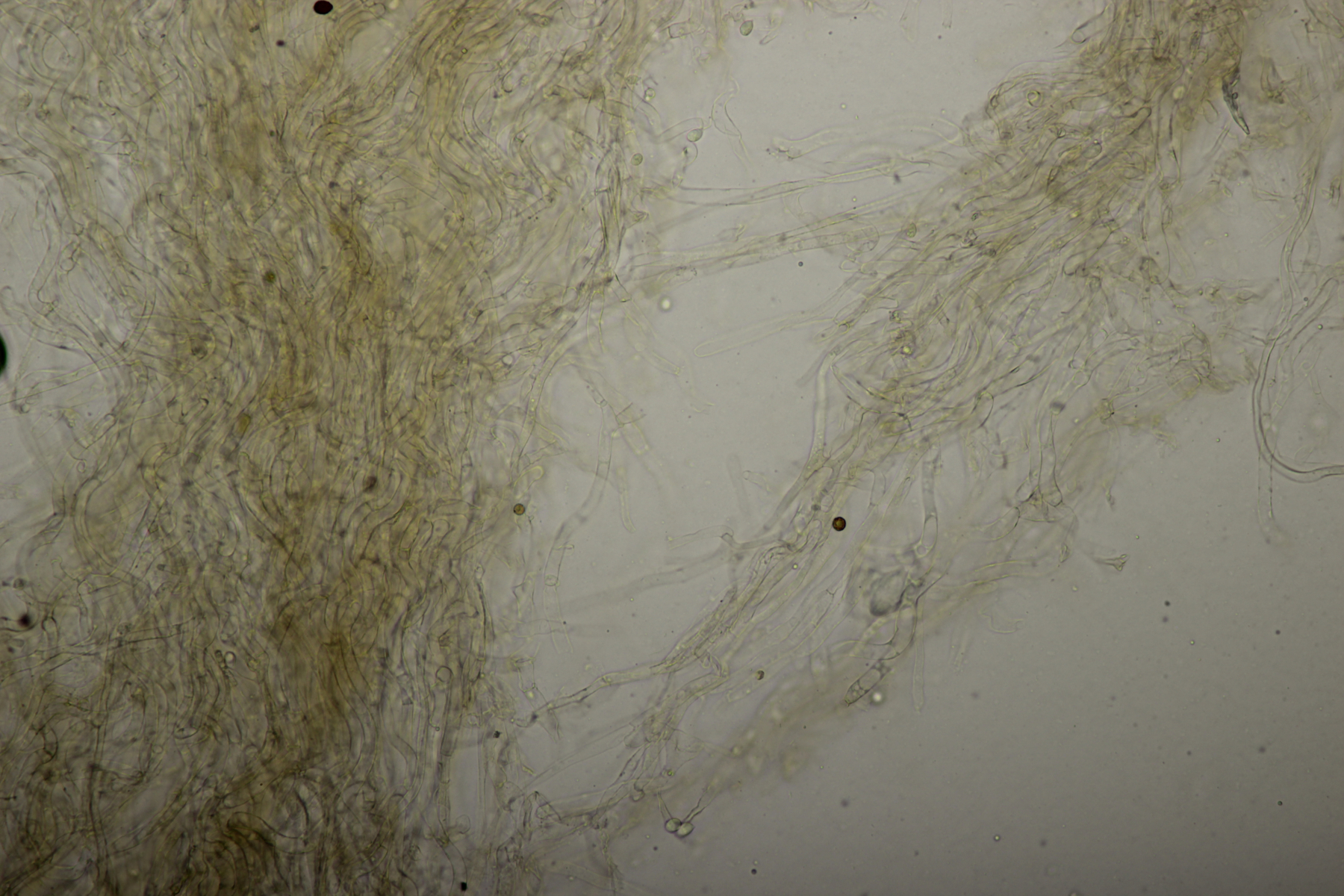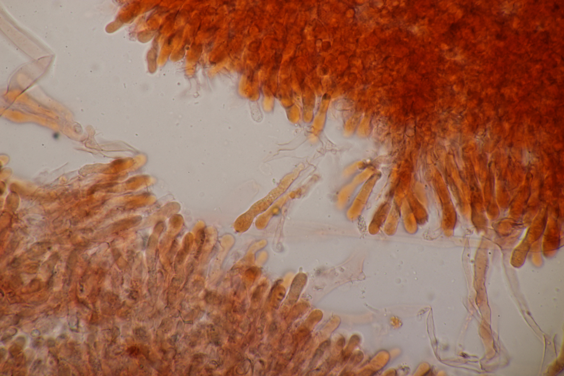 Sporen: Sporenpulver weiß; Sporen elliptisch, meist eher schmal, nach eigenen Messungen 7-10 x 4,5-6 (wohl aber wie bei allen Arten der Gruppe recht variabel), glatt, dünnwandig, inamyloid; Basidien überwiegend 4-sporig; Schnallen vorhanden; Hymenialzystiden fehlen; Stiel mit langen zylindrischen Haaren (im Grunde wohl nur abstehende Endzellen der Hyphen).