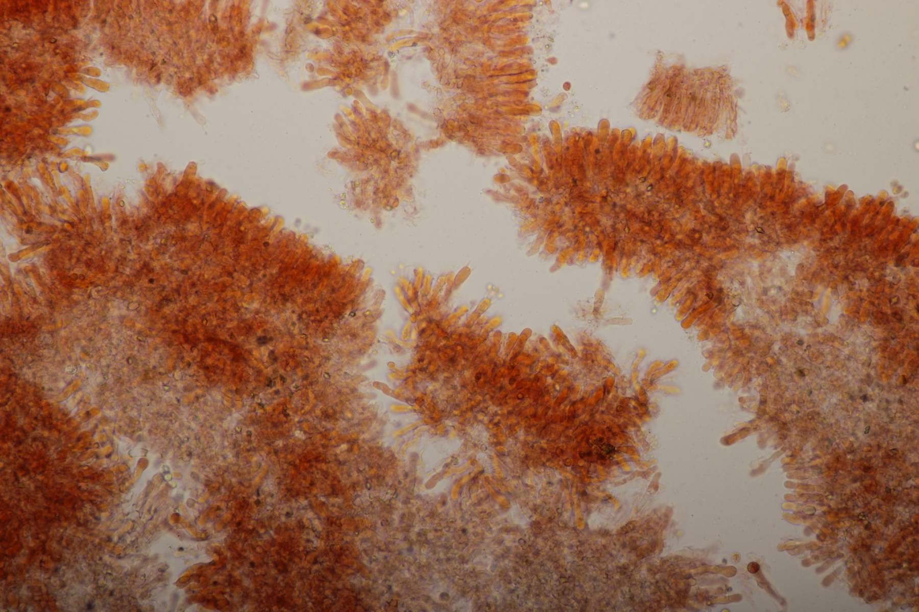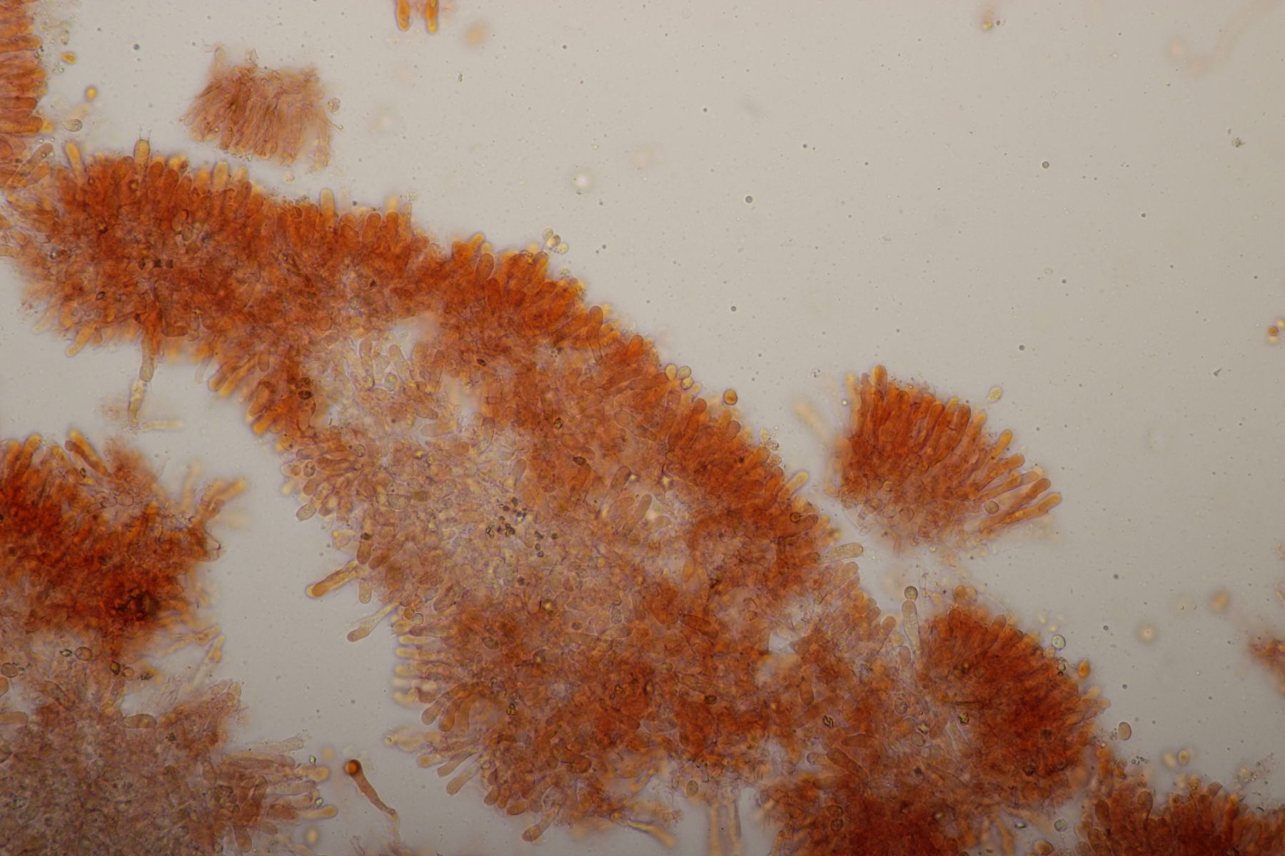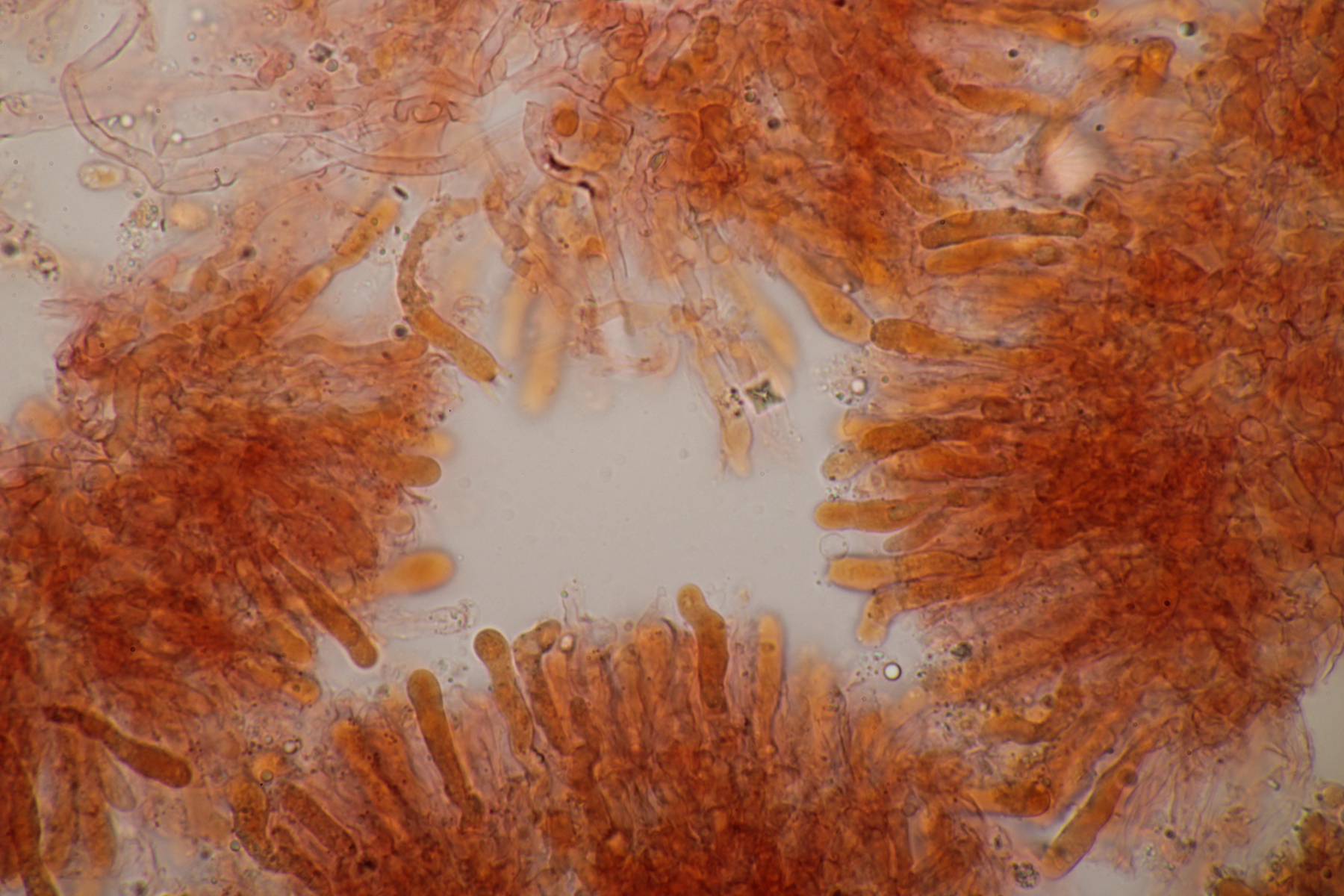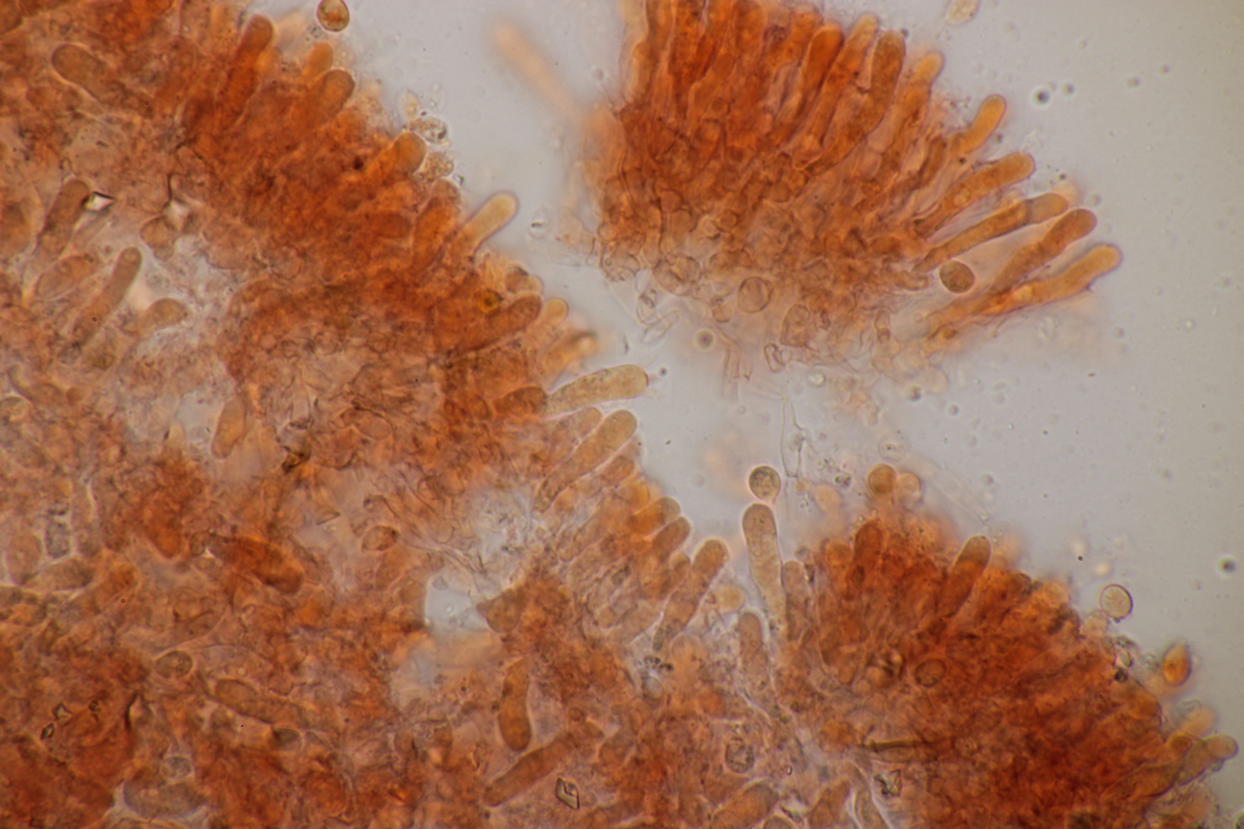Sporen: Sporenpulver weiß; Sporen elliptisch, meist eher schmal, nach eigenen Messungen 7-10 x 4,5-6 (wohl aber wie bei allen Arten der Gruppe recht variabel), glatt, dünnwandig, inamyloid; Basidien überwiegend 4-sporig; Schnallen vorhanden; Hymenialzystiden fehlen; Stiel mit langen zylindrischen Haaren (im Grunde wohl nur abstehende Endzellen der Hyphen).