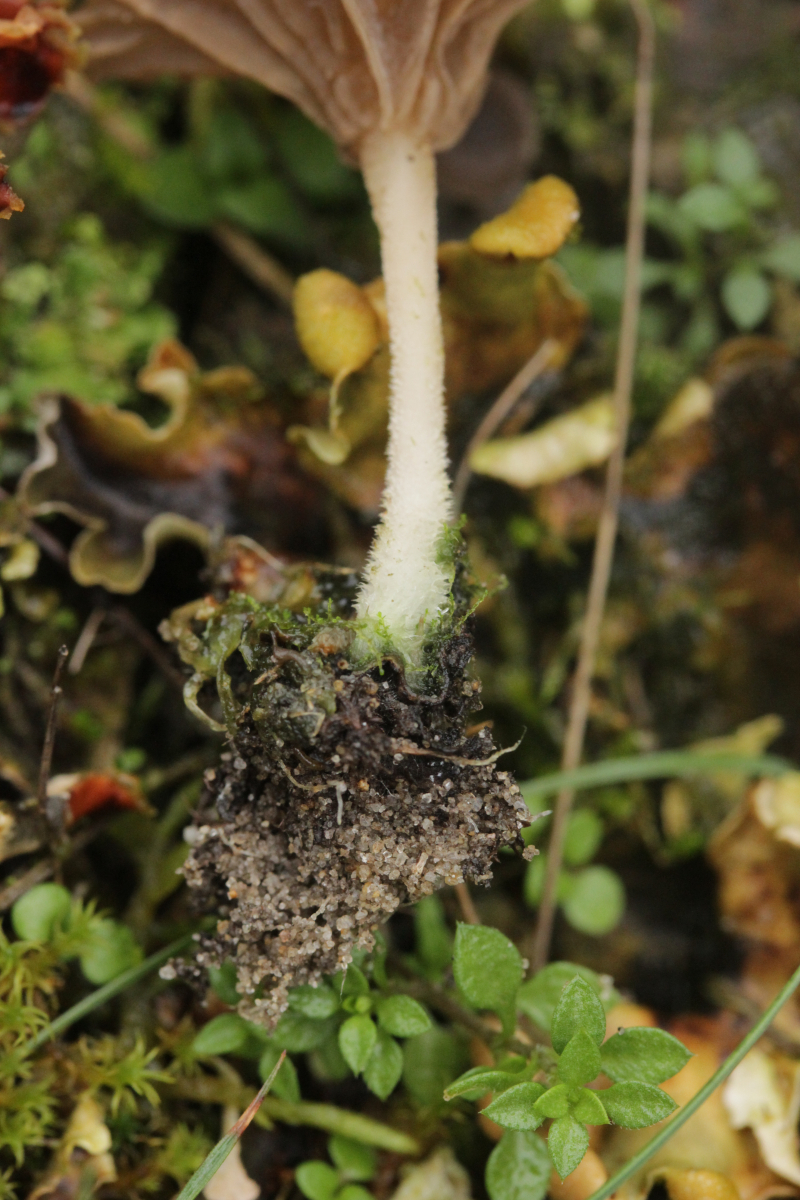 Stiele entspringen den abgestorbenen oder absterbenden Thalli von Hundsflechten (Peltigera spec.); meist etwas unregelmäßig gebogen oder auch etwas verdreht und dann unrund; ockerlich bis graubraun, meist auf ganzer Länge fein bereift bzw. mit feinen Häärchen (Lupe); von der Stielbasis her mit weißlichem Filz, der sich bisweilen bis zur Stielspitze hinaufziehen kann; Stielbasis oft etwas verdickt.
