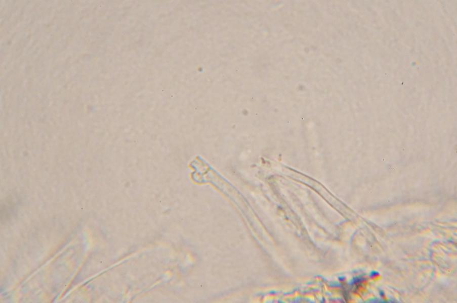 ich habe mal versucht das Velum zu mikroskopieren. Gibt es da eventuell einen Trick, wie man am Besten Velum untersucht? Jedenfalls habe ich unter der Lupe vorsichtig etwas abgeschabt. Als jedoch das Wasser und das Deckgläschen zum Einsatz kam, hat sich das Stückchen Velum in jede erdenkliche Ecke verteilt
