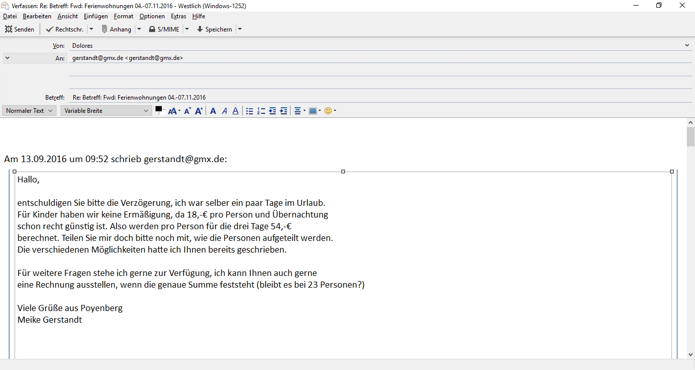 Als Teilnehmerzahl gebe ich ihr 20 (+/- 1) an.Den folgenden Teilnehmer bestätige ich schon mal den Eingang des Beitrags für die Übernachtung: