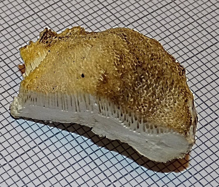 Also mal noch die Poren ausgemessen - da wo sie frisch sind ca. 3 / mm, wo schon etwas älter 2 / mm. Also mal das Stück von Coroliopsis trogii daneben vermessen, ist ein ziemlich reifes Ex. --- Mist auch 2 / mm. (es verdichtet sich die Idee dass ihr Recht haben könntet).