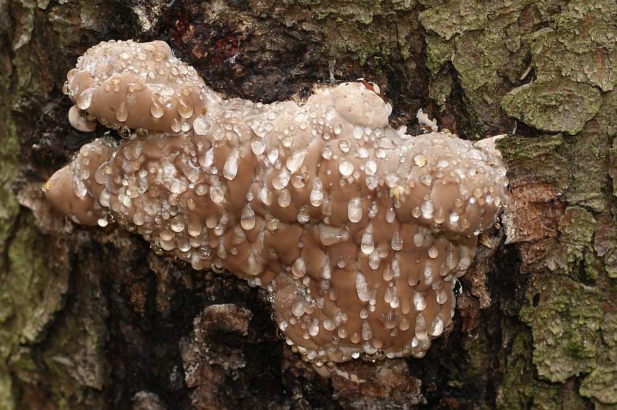 Dieser hier an einer Fichte ist vermutlich - mal wieder - ein Rotrandiger Baumschwamm??? Die kaffeebraune Grundfarbe ließ mich zuerst etwas anderes vermuten, aber ganz oben leuchtet ein kleiner roter Fleck, und die Guttationstropfen würden auch prima passen.