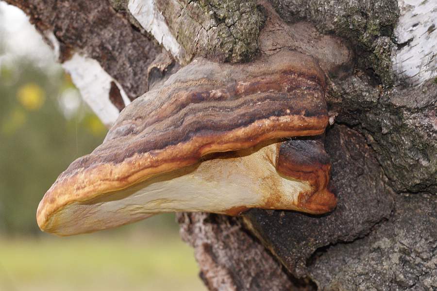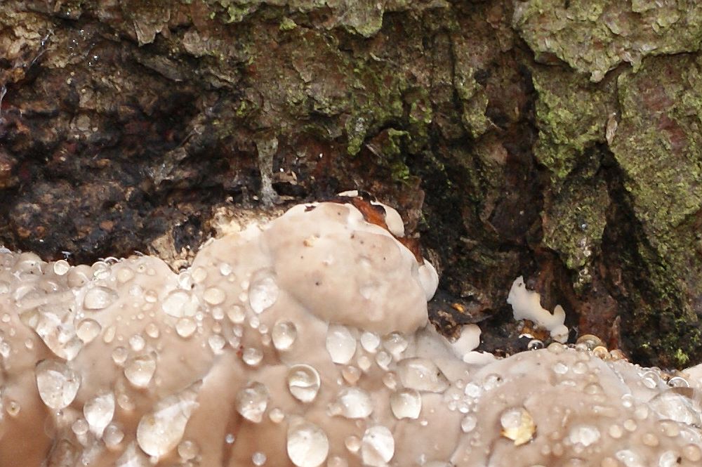Der letzte wuchs an einer Birke und hat sich hartnäckig all meinen Versuchen widersetzt, ihm einen halbwegs passenden Namen zu geben. Die Unterseite war überwiegend weiss, sehr feinporig, an einigen Stellen abe auch braun bis bräunlich verfärbt. Oberseite mit gut erkennbaren Zuwachszonen, gräulich-dunkel bis leuchtend rotbraun, je nachdem von wo man ihn angesehen hat. Die äußerste Zuwachskante leuchtend hell-rotbraun. Tja, den Zunderschwamm habe ich schon verworfen...