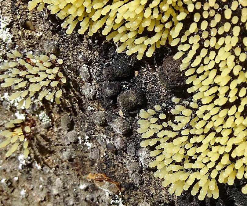 Badhamia kannst du definitiv ausschließen, die Gattung hat immer kalkhaltiges Capillitium und auch auf der Oberfläche der einzelnen Fruchtkörper findet man Kalk.