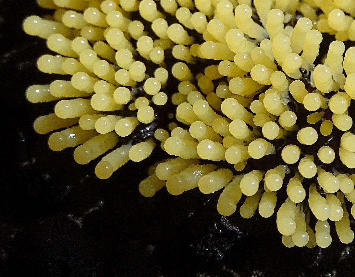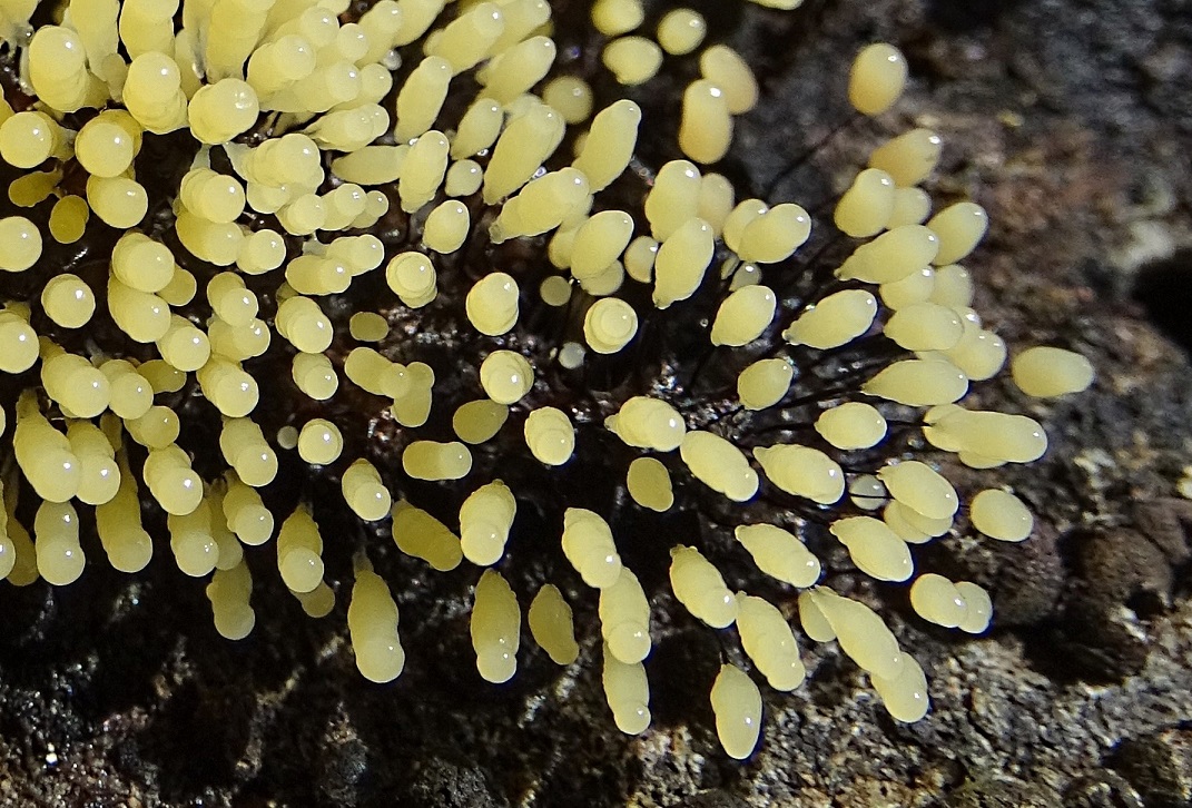 hellgelbe Schleimpilze an Fäden