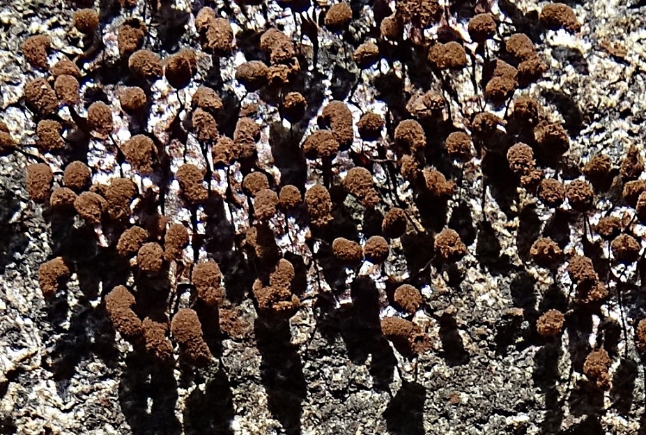 Zwei Proben hatte ich mitgenommen, wobei die unreifen den Transport nicht überlebt haben - das Foto zeigt nur noch die fadenförmigen Stängel mit Nichts mehr dran. Allerdings ist unten eine rotbraun glänzende Schicht zu erahnen, woraus sie entspringen - unter dem Bino selbst - dessen Lampe ich hier für das Foto missbruacht habe, ist es b esser zu sehen. Schön sind jedoch die reifen Ex. geblieben, die haben reichlich ausgesport und es ist jetzt alles hellbraun bepudert - ich denke das kommt aus dem Bild auch ganz gut rüber.