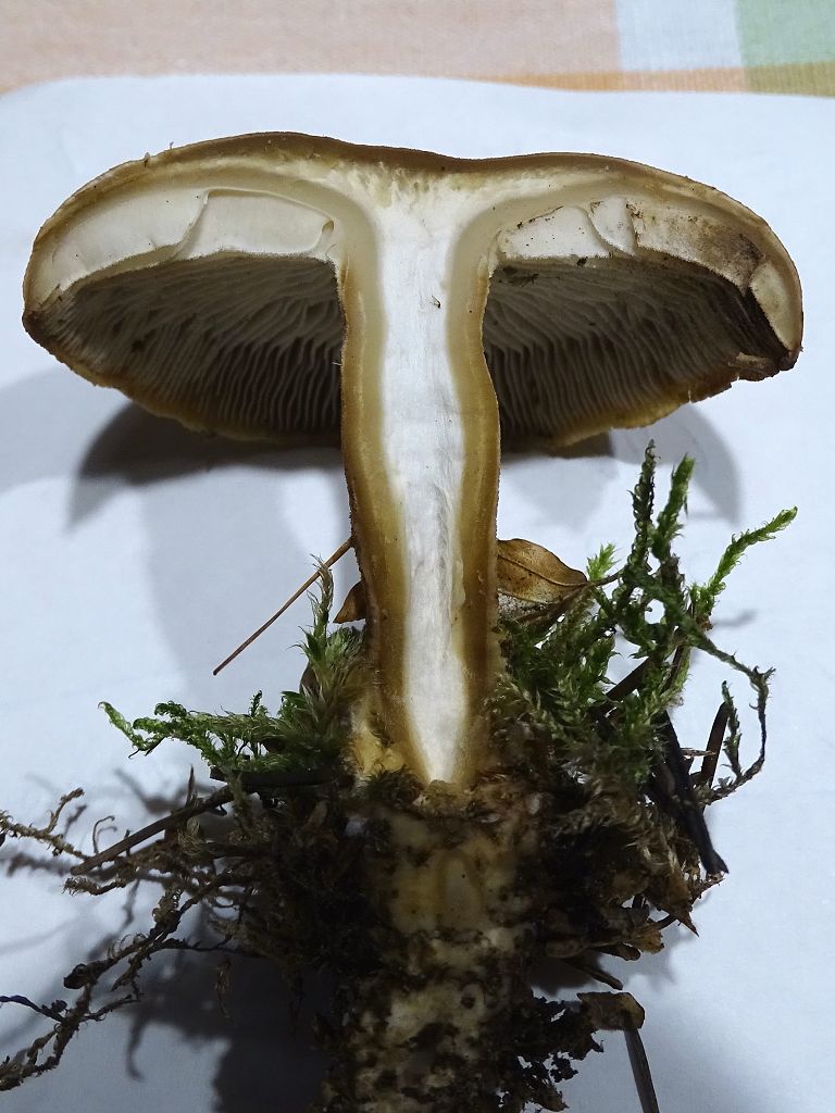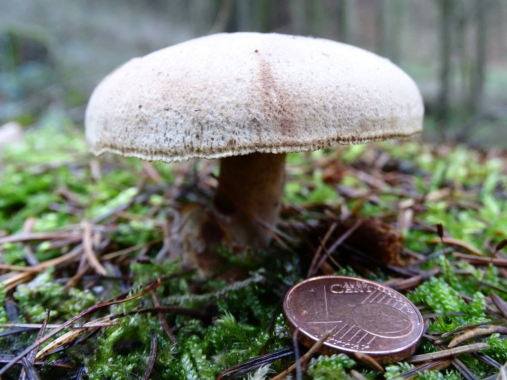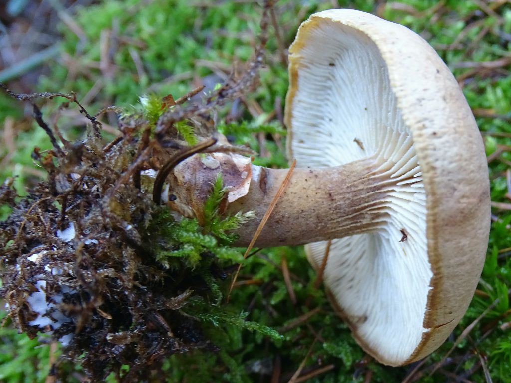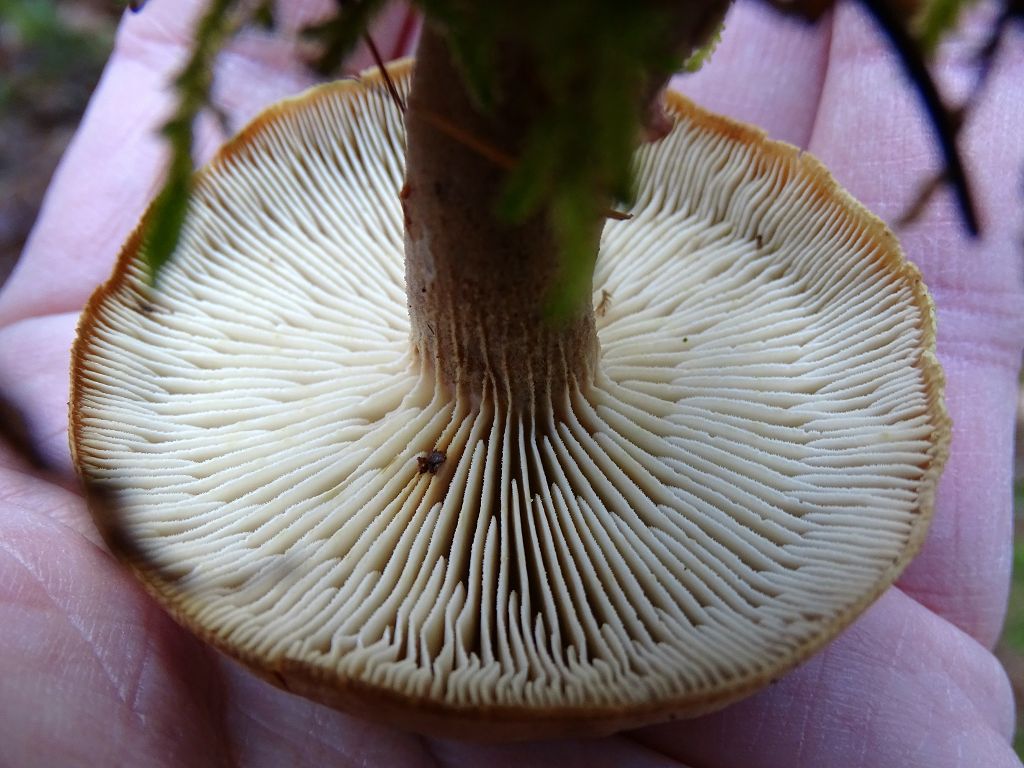 Lamellen: hell zimtbraun, wellig, am Stiel herablaufend, mit mehreren Zonen von Zwischenlamellen, Schneiden fransig