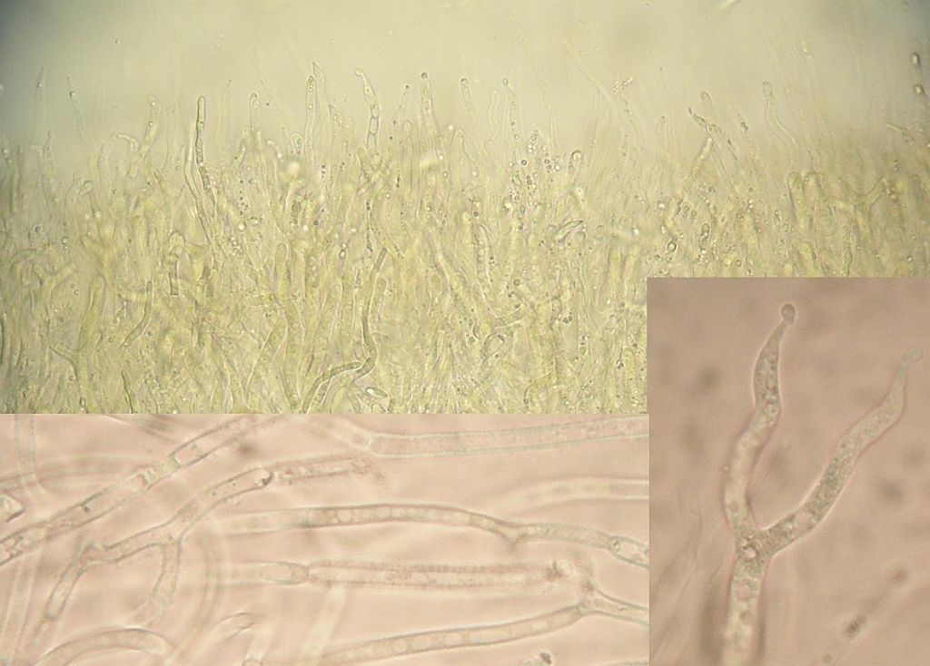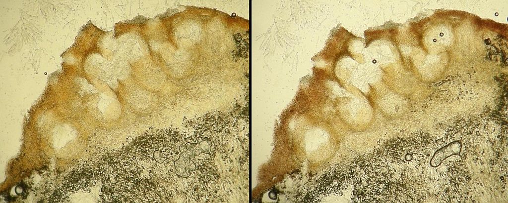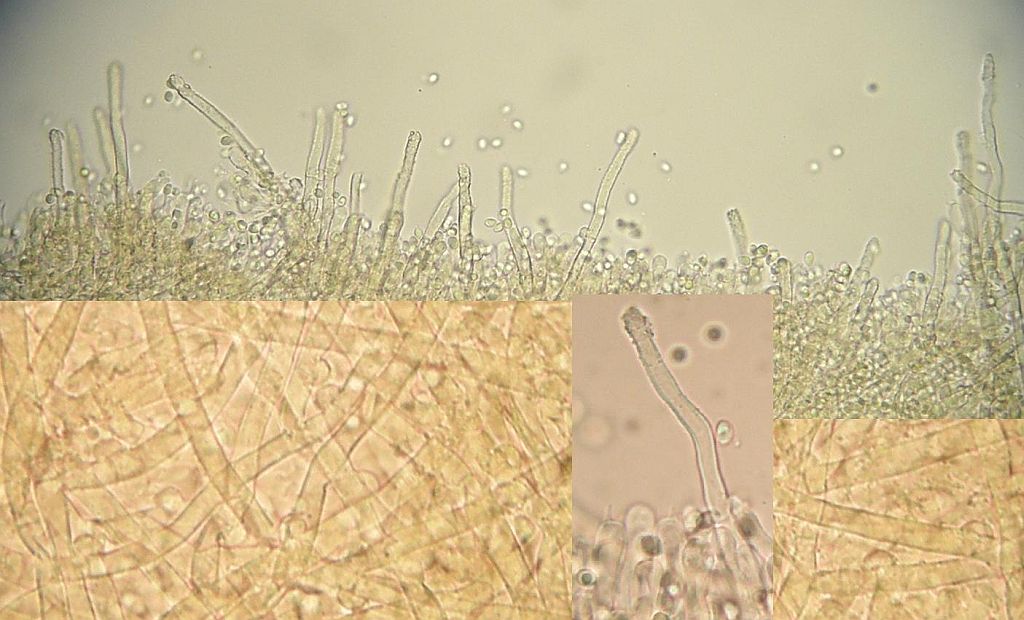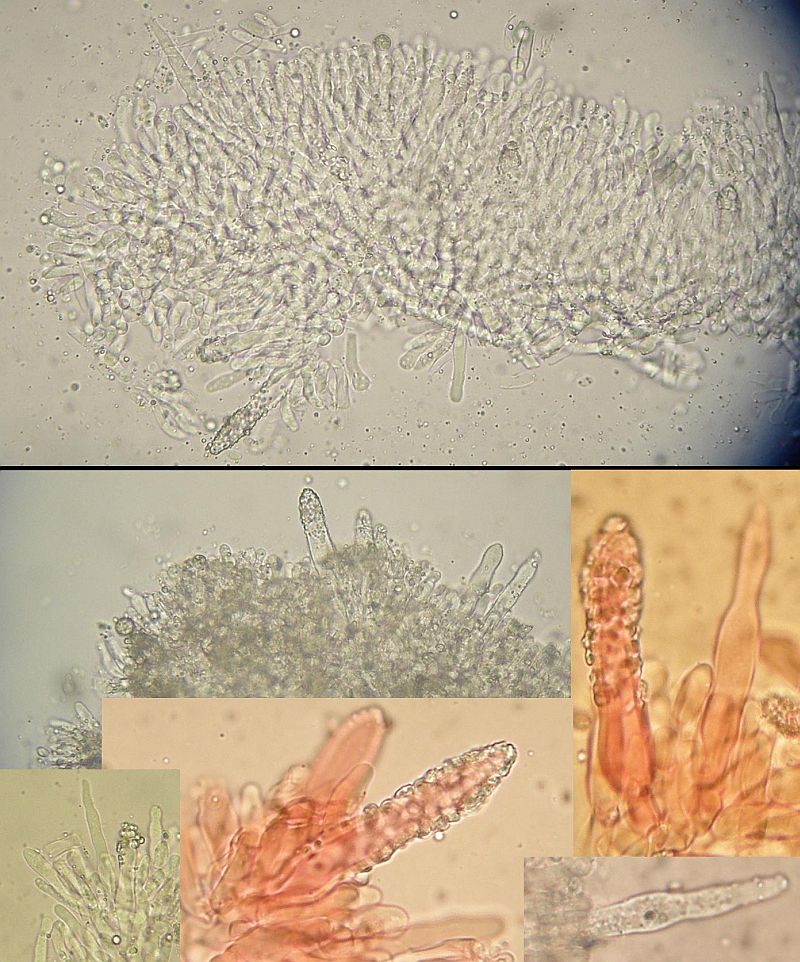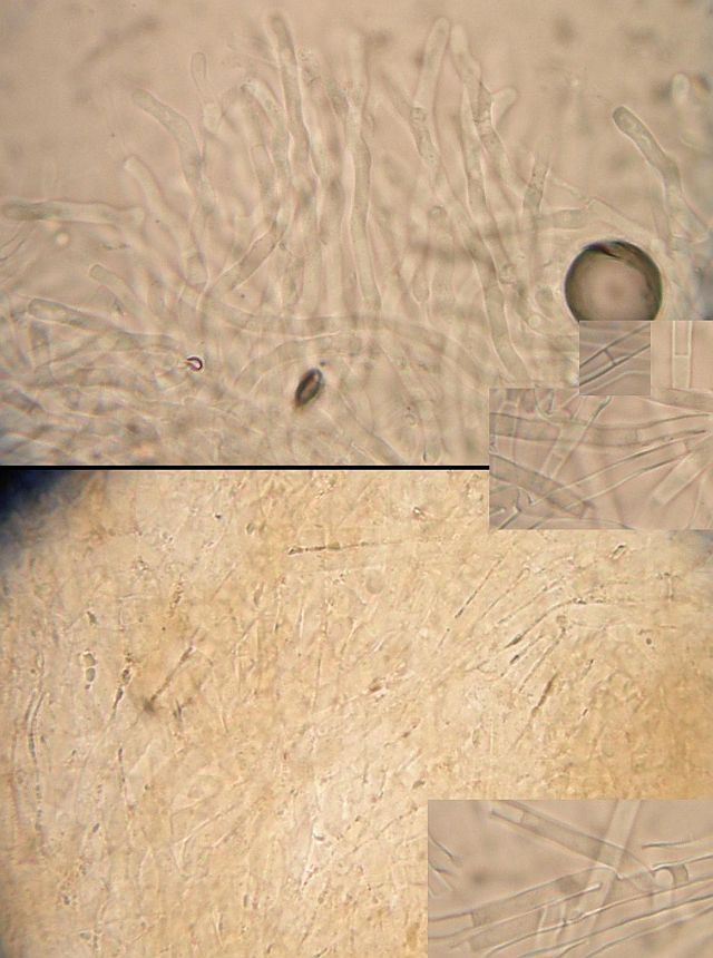 Maximal irritierend waren bei der Bestimmung diese Hyphenenden mit dicker, harzig-kristalliner Kappe knapp über dem Subikulum in der Trama. Die sind alleridngs nur in Wasser sichtbar, schon in 3% KOH verschwindet diese Kappe, die ein wenig an zu klein geratene Halozystiden von Resinicium erinnert.