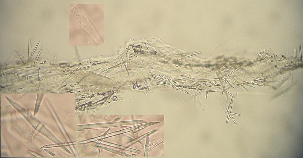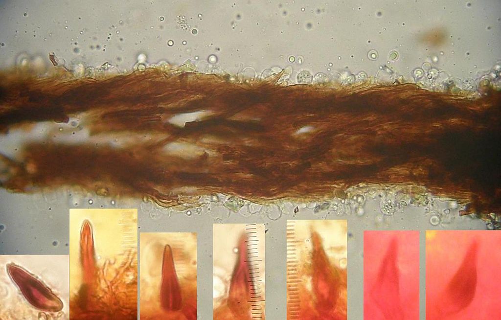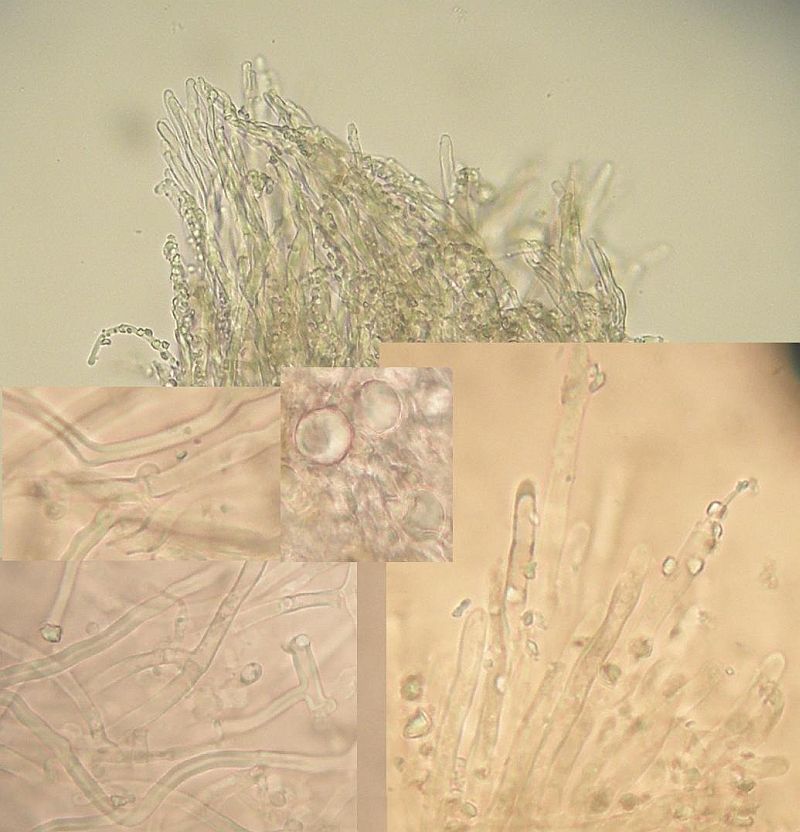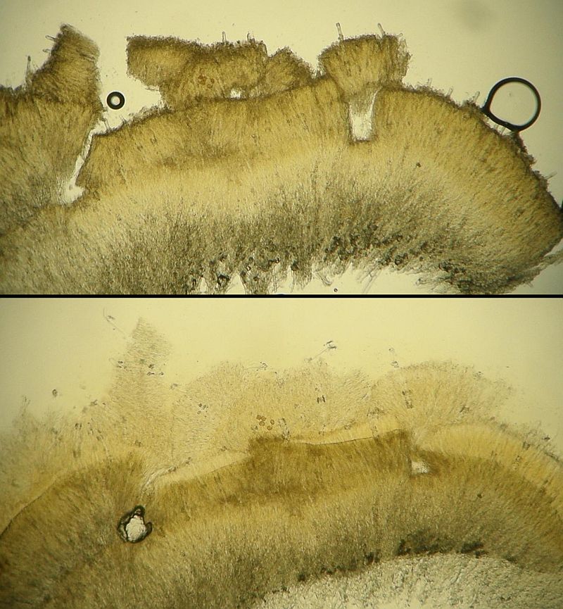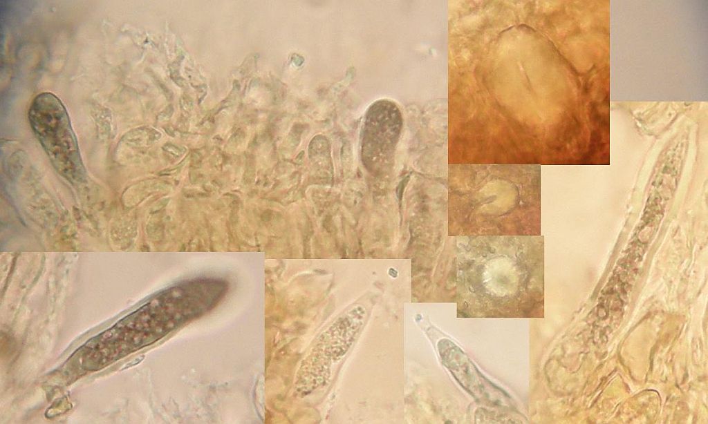 Maximal irritierend waren bei der Bestimmung diese Hyphenenden mit dicker, harzig-kristalliner Kappe knapp über dem Subikulum in der Trama. Die sind alleridngs nur in Wasser sichtbar, schon in 3% KOH verschwindet diese Kappe, die ein wenig an zu klein geratene Halozystiden von Resinicium erinnert.