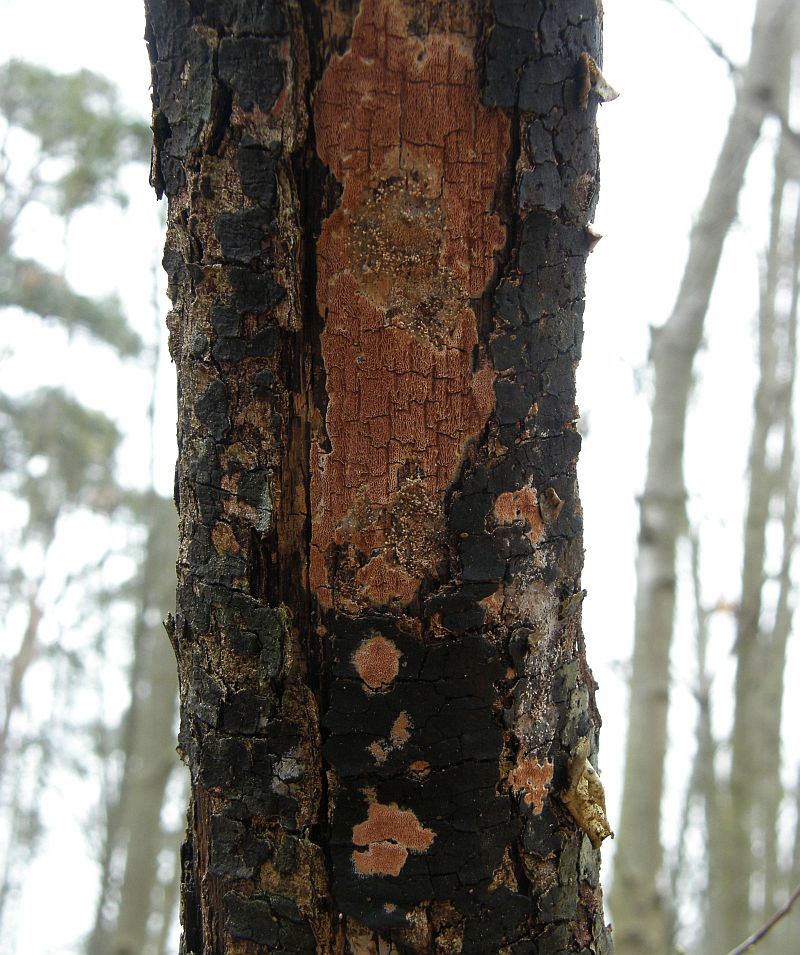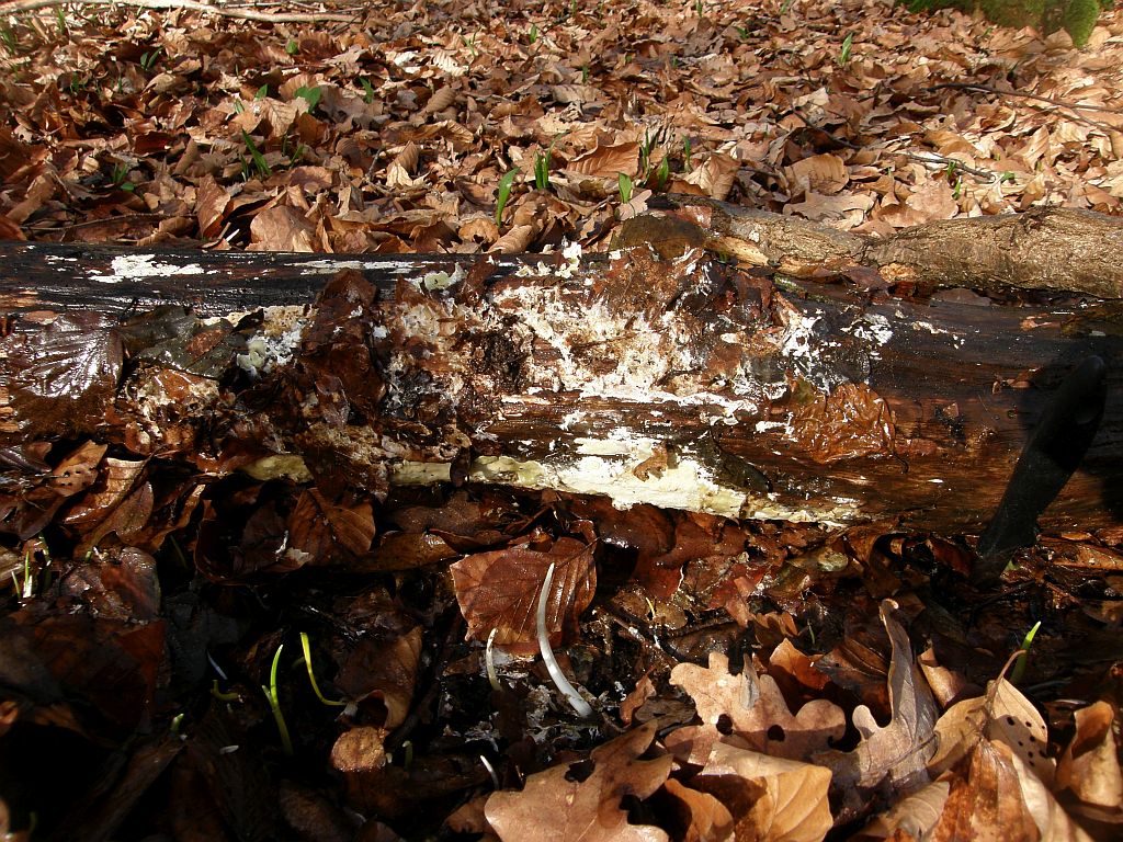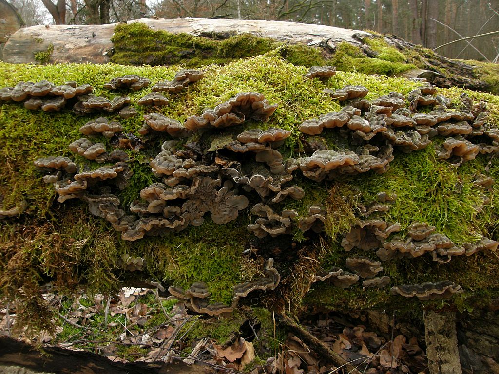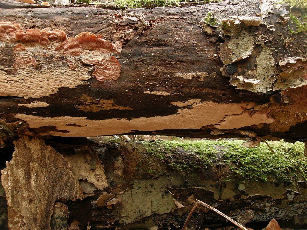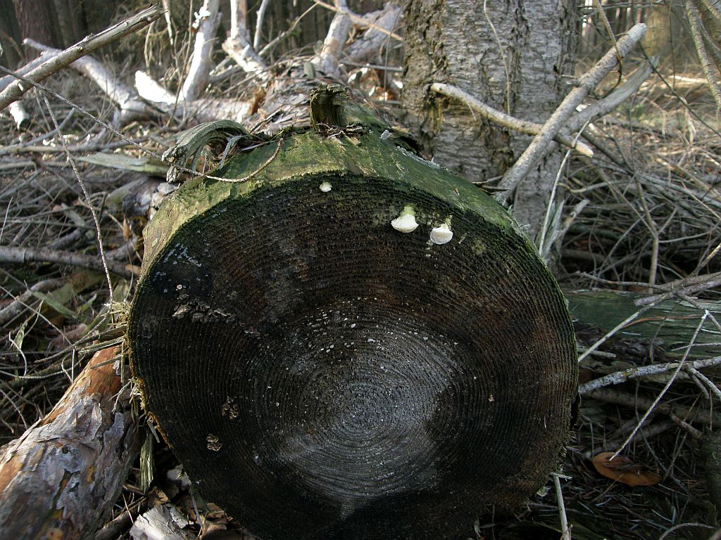 Zunächst an liegenden Kieferstämmen