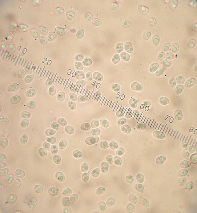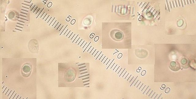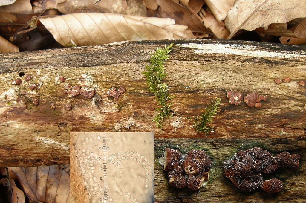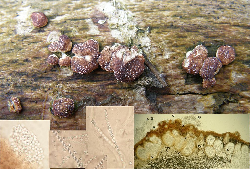 Allein die teils kugeligen und gelegentlich fein warzigen Sporen sind merkwürdig. Zwar wird beschrieben, daß das bei Radulomyces confluens vorkommen darf, aber ich bijn momentan nicht in der Lage, dann die trennung von Radulomyces rickii nachzuvollziehen. Wenn ich das richtig verstehe, kann das genauso gut diese Art sein, aber dann könnte jede Aufsammlung von R. confluens mit teils fein warzigen Sporen R. rickii sein?!?