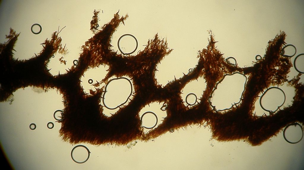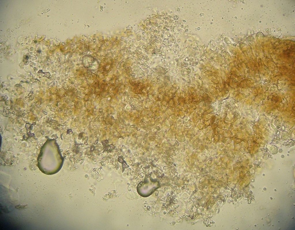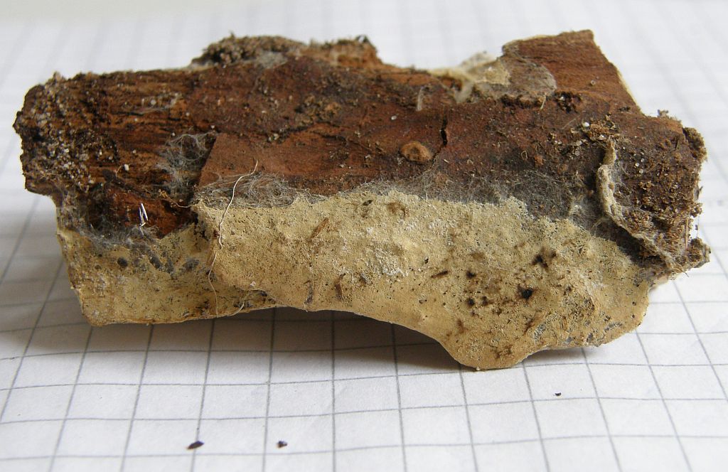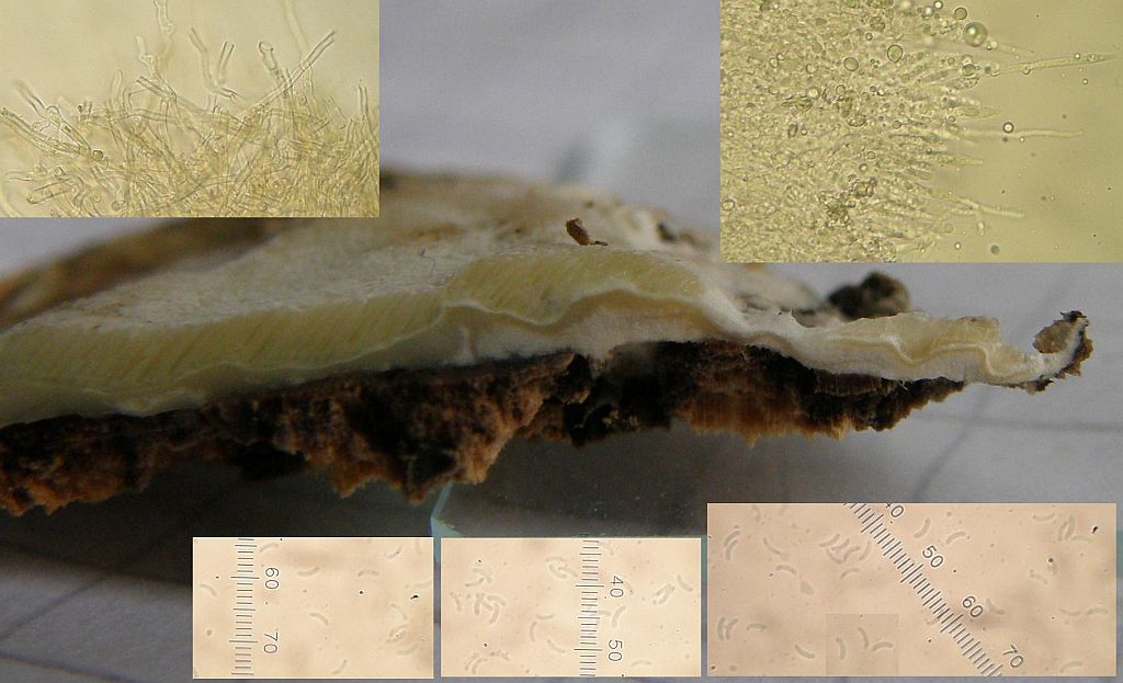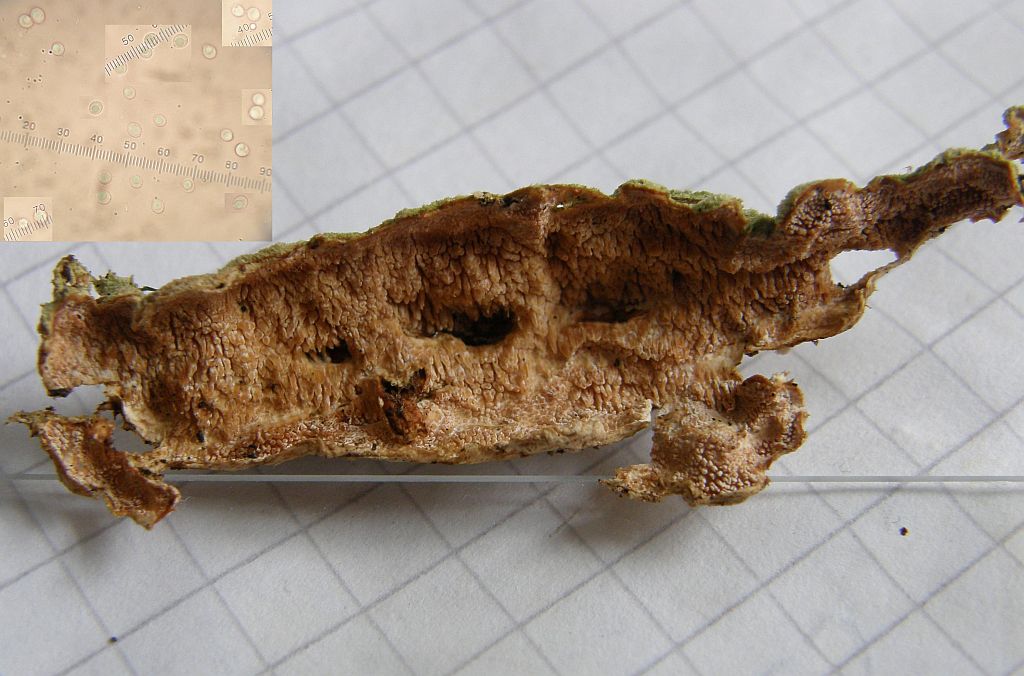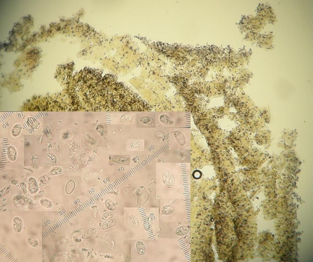 keine Ahnung. Die inkrustierten, skeletoiden Hyphidien sind ziemlich diffus, haben ihre Inkrustierung größtenteils verloren. Das Hymenium ist so gut wie weg, da ist keine saubere Basidie mehr zu sehen. Die 5 oder 6 Sporen, die ich finde, können ganz gut dazu gehören, müssen aber nicht.