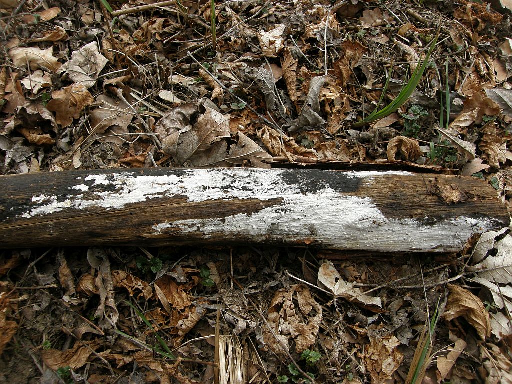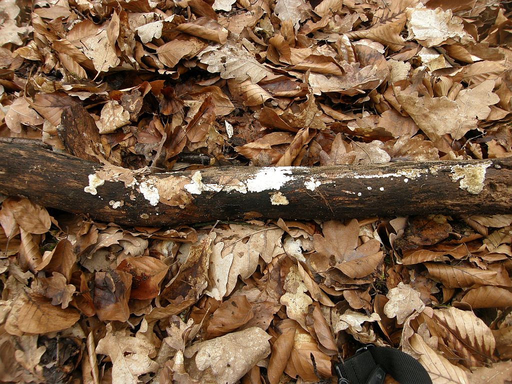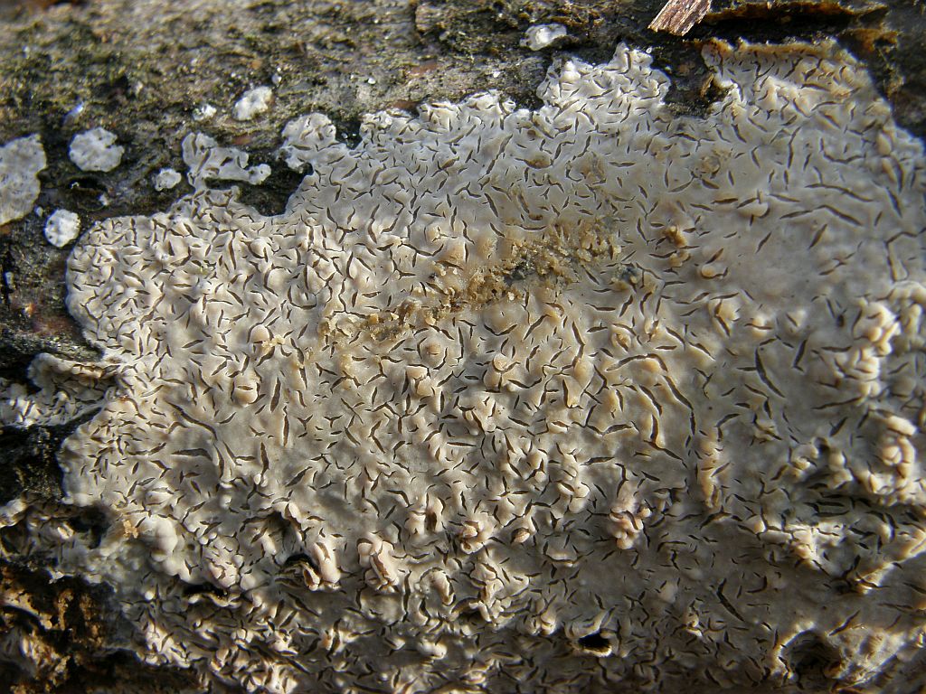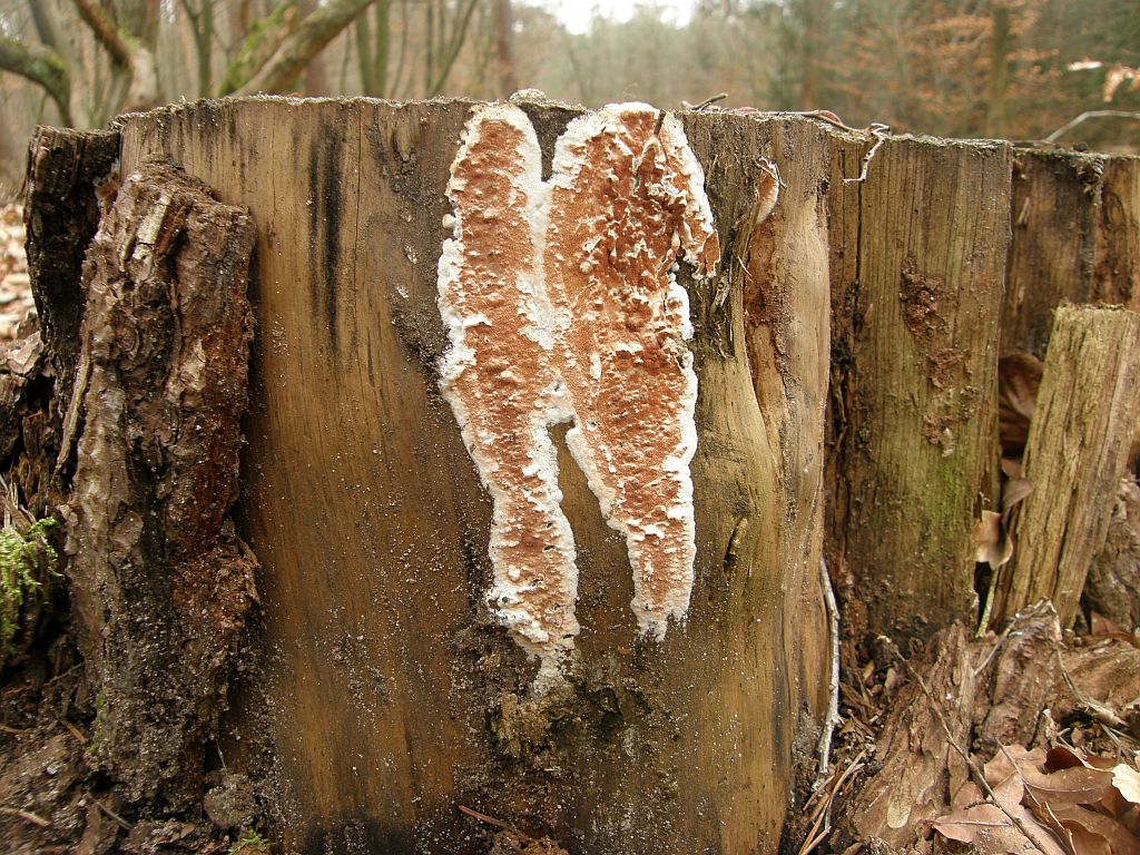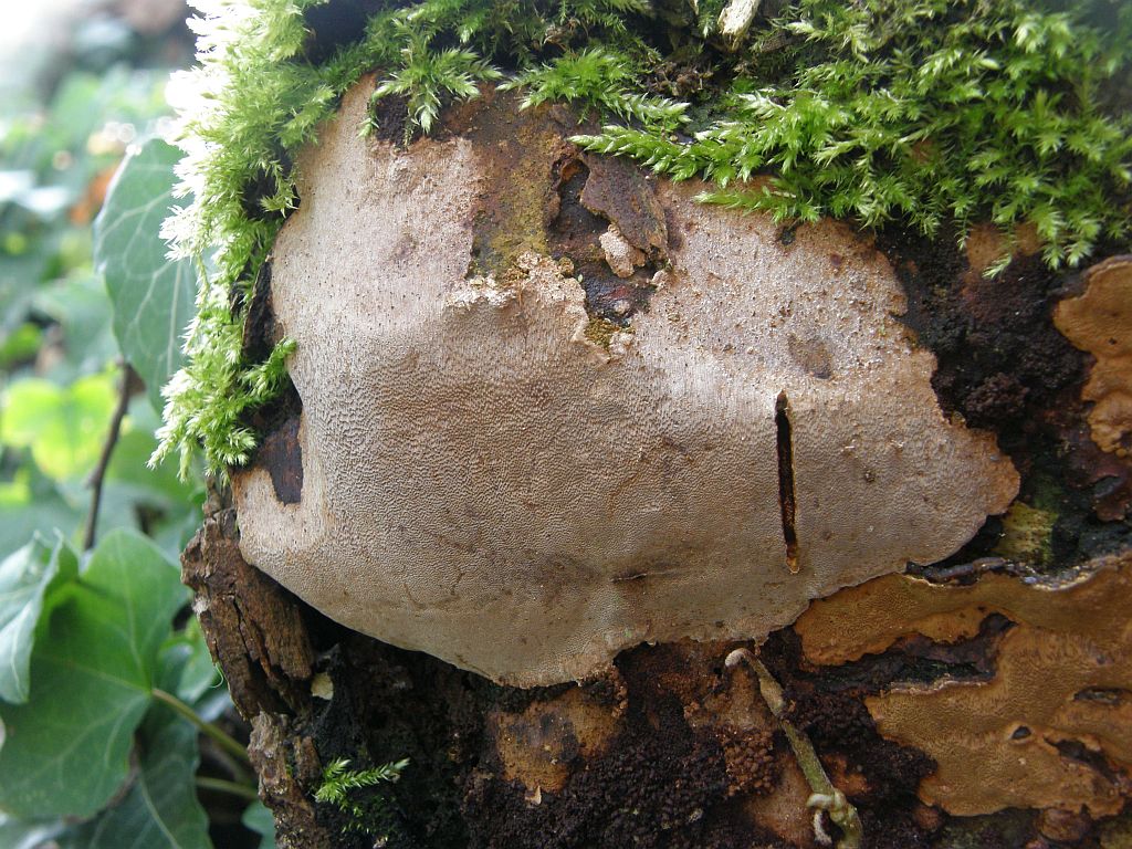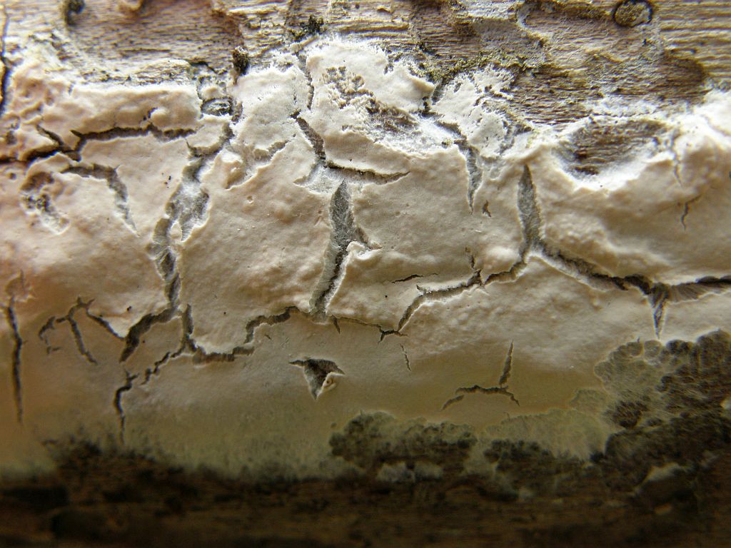 Neben dem zweiten (rissigen) Radulomyces confluens sitzt dicht an dich ein weiterer Rindenpilz, der seinen Fruchtkörper mit einer hübschen Trennlinie abgegrenzt hält: