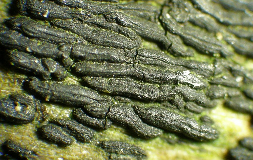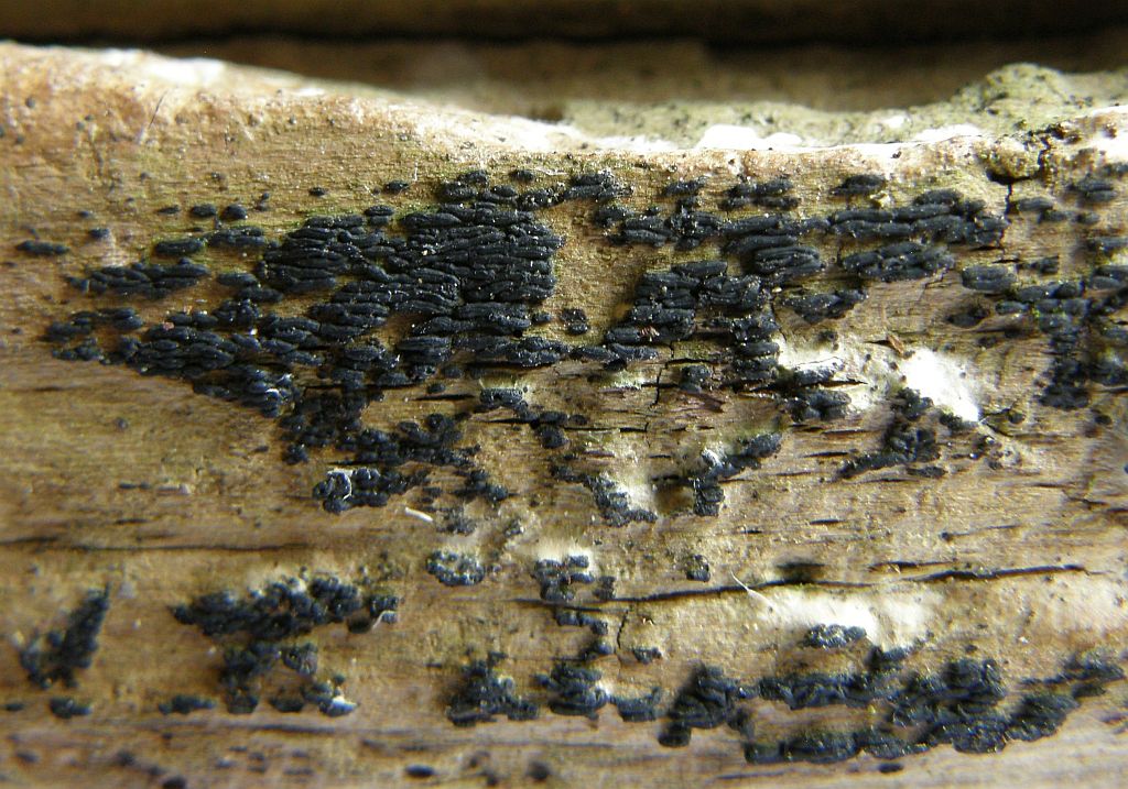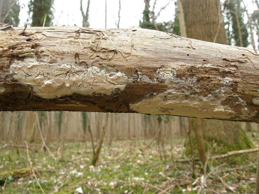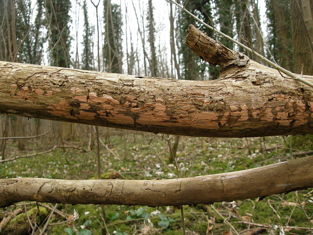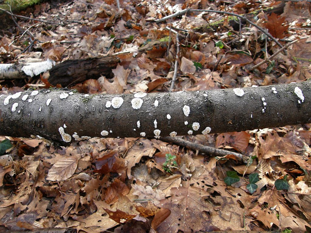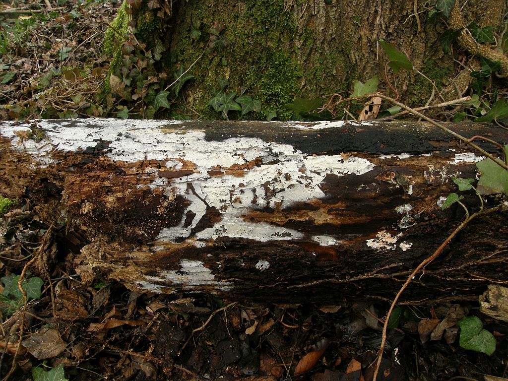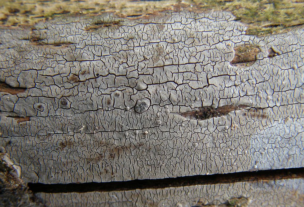 Neben dem zweiten (rissigen) Radulomyces confluens sitzt dicht an dich ein weiterer Rindenpilz, der seinen Fruchtkörper mit einer hübschen Trennlinie abgegrenzt hält:
