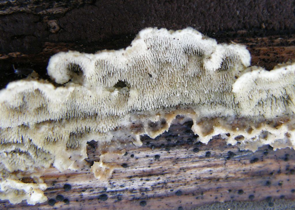 Pilz ist dimitisch, wächst an manchen Stellen resupinat, bildet aber auch recht regelmäßig kleine Hutkanten und Hütchen. Stacheln fibrös - elastisch, Stachelspitzen teils mehrfach fein geteilt (ausgefranst oder gehört das so?), Schnallen vorhanden, (echte) Skeletthyphen auch.
