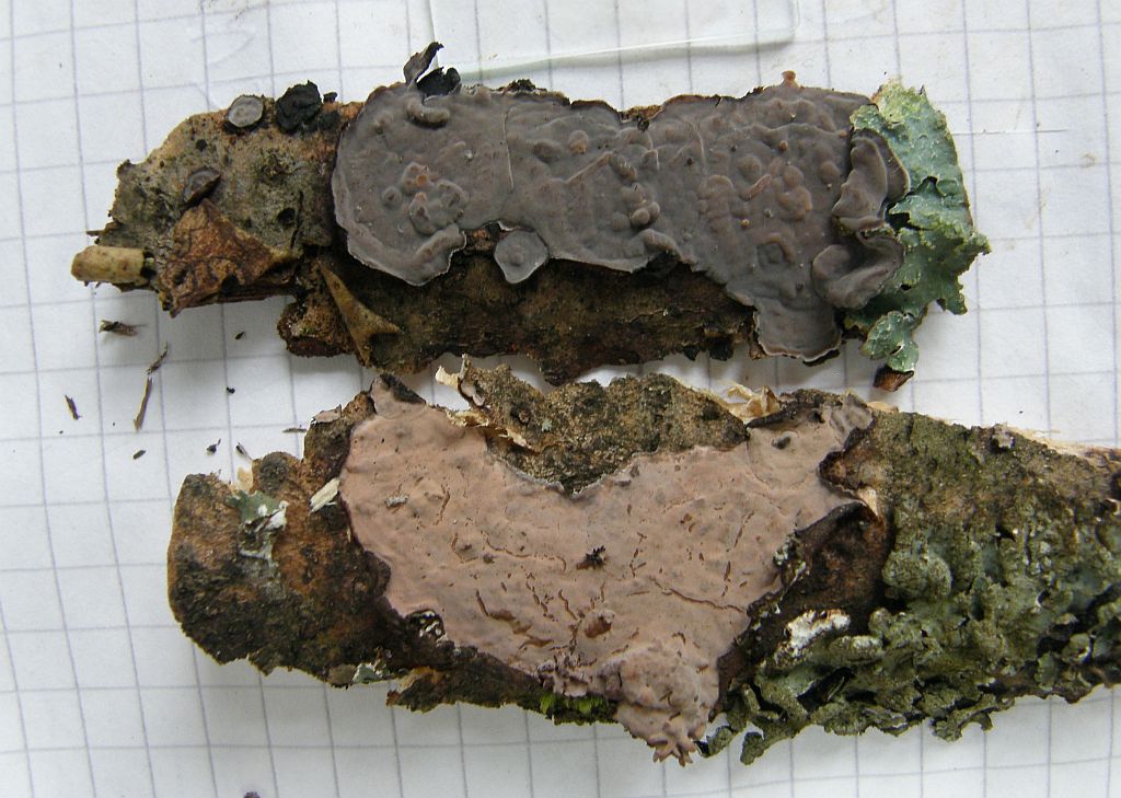 Das sind zwei unterschiedliche Kollektionen an zwei verschiedenen Laubholzästen. In der Haptik sind sich beide ähnlich (Phlebia - artig wachsig) und so unterschiedlich beide Kollektionen optisch wirken, mikroskopisch ist beides die gleiche Art. Wenn nicht...