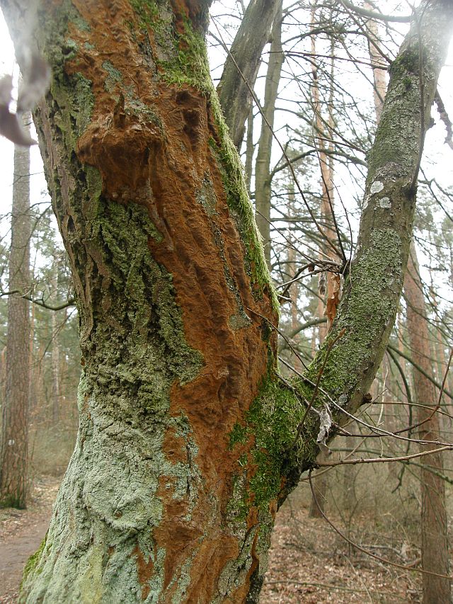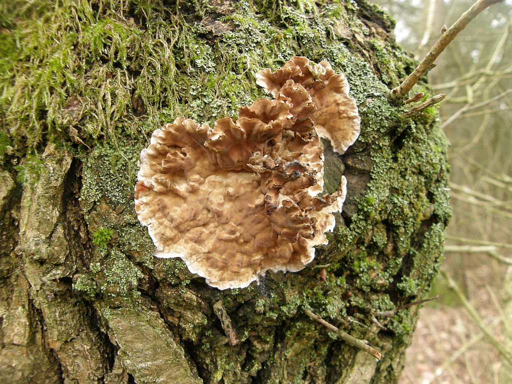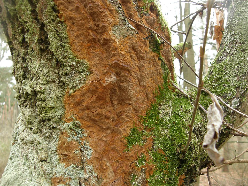 Ein Stückchen weiter hat man ein Stück Glück, da sitzt an einigen Ästen von Wildkirschen der klassische Doppelgänger von Radulomyces molaris, nämlich