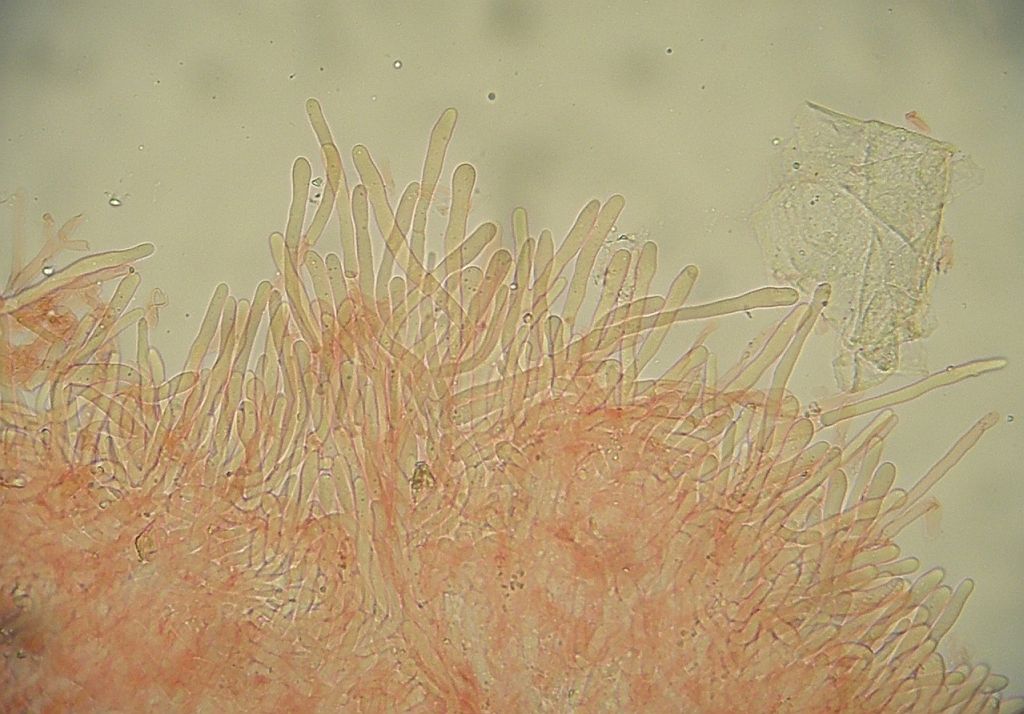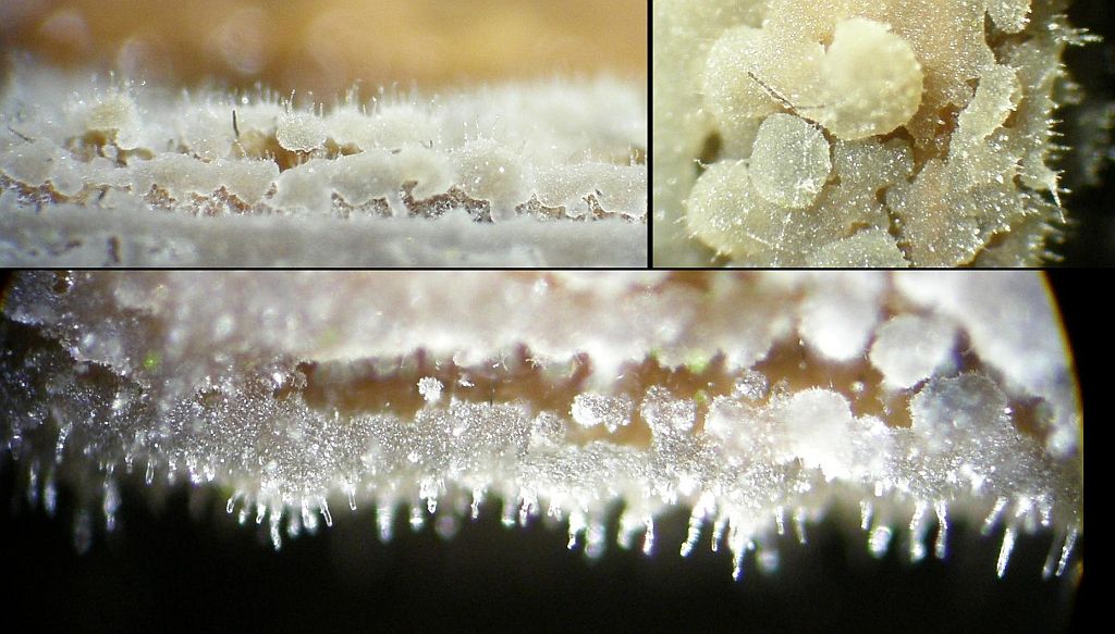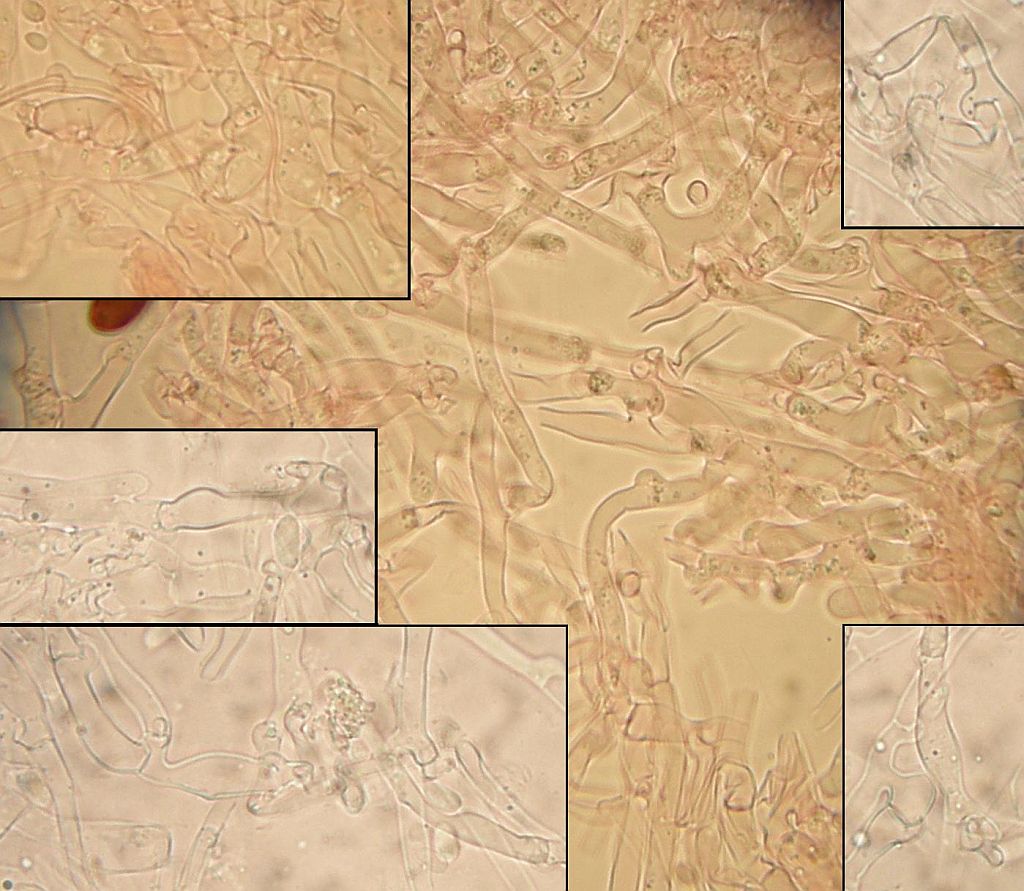 Jedenfalls hielt ich das aus vollster Überzeugung für klar dimitisch, da sind lange, parallel verlaufende Skeletthyphen in der Trama der Zähnchen. Aber die Autoren, die die Art als "pseudodimitisch" bezeichnen, haben wohl recht: Diese "Skeletthyphen" sitzen nämlich im Subikulum an ganz normalen, generativen Hyphen. Mit Schnalle. nur von da aus machen sie sich halt unseptiert auf den weiten Weg bis in die Spitzen der Zähnchen, wo sie allerhand vorwiegend irgendwie platte Kristalle mit sich herumtragen.