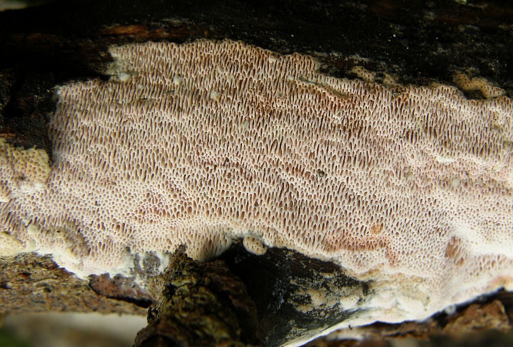 Beim ersten dachte ich gleich an Schizopora paradoxa. Aber die Konsistenz ist etwas anders, auch die Form der Stacheln zum Rand hin und das Aussehen der Fruchtkörper dort.