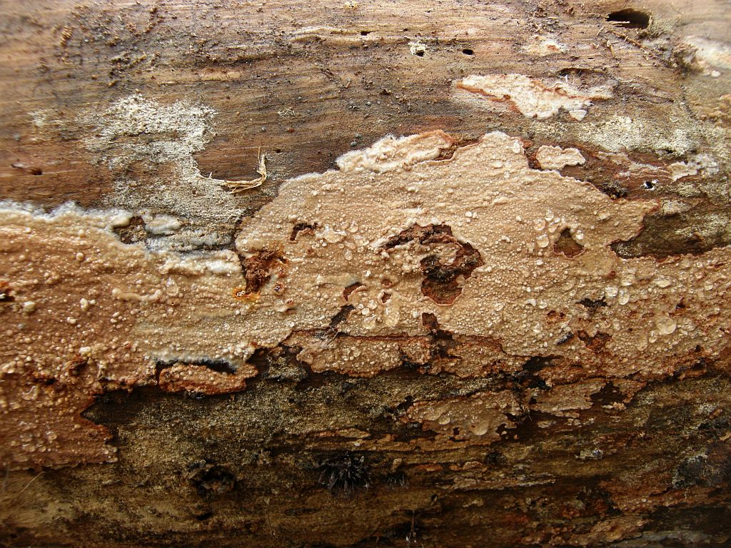 Das wäre dann nach meinem Dafürhalten Hyphoderma medioburiense (Harztropfen - Rindenpilz):