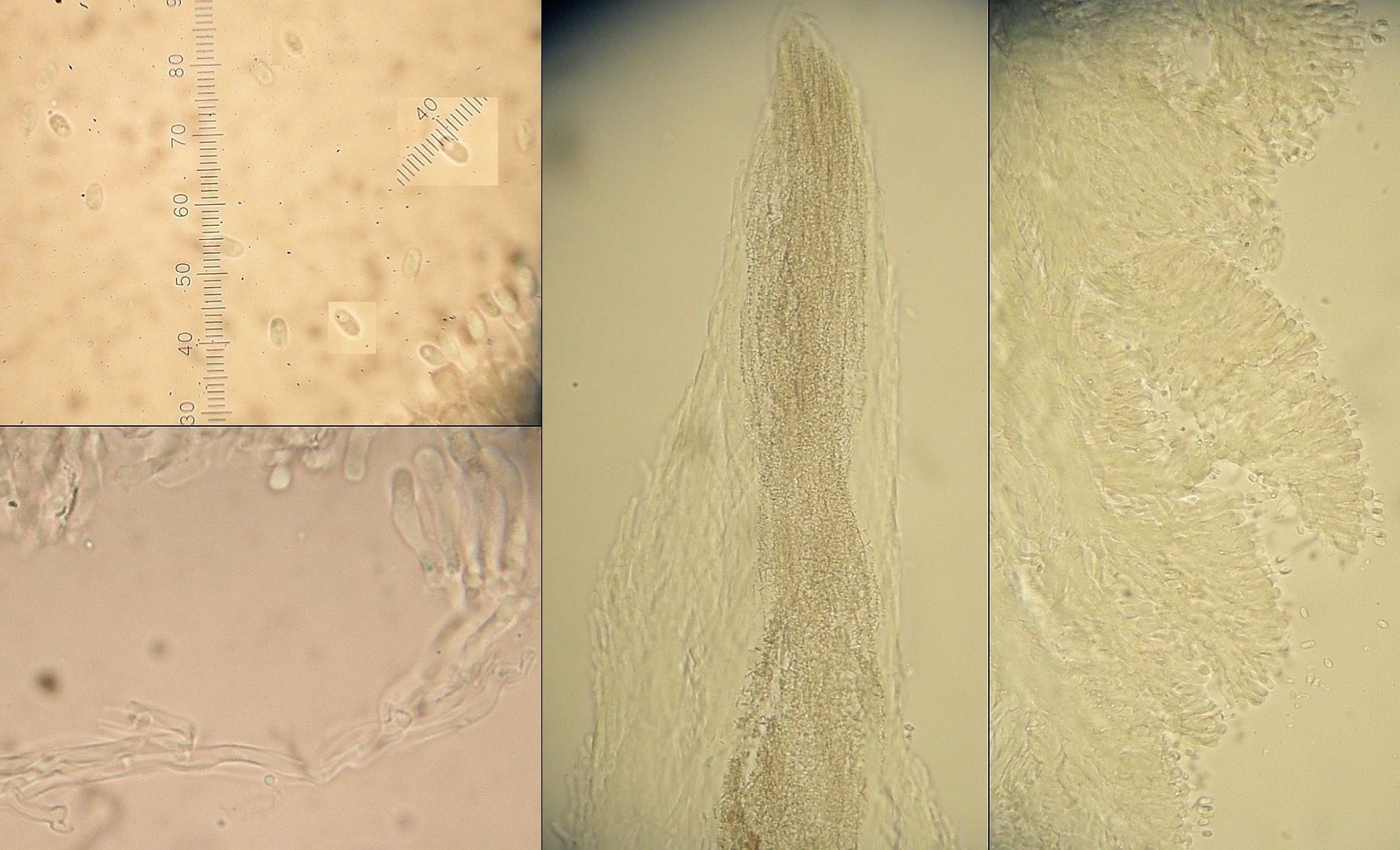 Ansonsten gibt es ja noch ein paar weitere Merkmale: Hyphen normal ausgebildet (nicht kurzzellig), keine weiteren Zystiden bis auf die langen, irregulär zylindrischen und teils angedeutet kopfigen; und dann eben noch die Riesensporen, die Größen bis zu 19x6 µm erreichen.