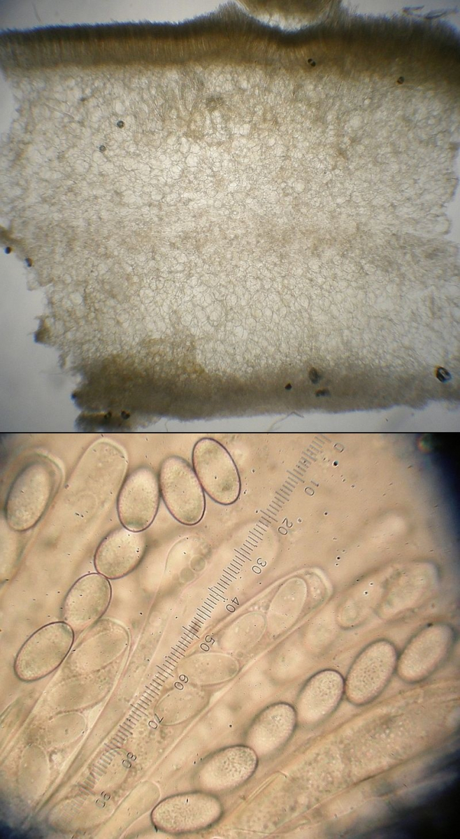 Leider noch unreif, daher auch ohne Mikrobilder. Hat aber die typischen, langen und gelifizierten "Substrathyphen" an der Außenseite. Und wurde im letzten Jahr anhand reifer Apos auch an exakt dem Standort ausgiebig untersucht.