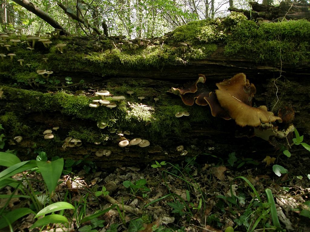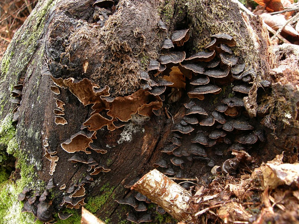 Und weil's einfach hübsch aussieht, noch ein Stilleben von Pycnoporus cinnabarinus (Zinnoberporling) und Trametes hirsuta (Striegelige Tramete) an liegendem Esskastanienstamm: