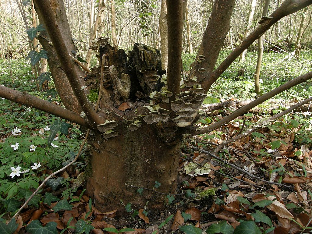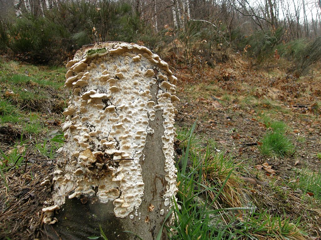 An einem völlig verwitterten Stumpf entweder von Eiche oder von Esskastanie sitzt ein Rudel von Hymenochaete rubiginosa (Umberbraune Borstenscheibe):