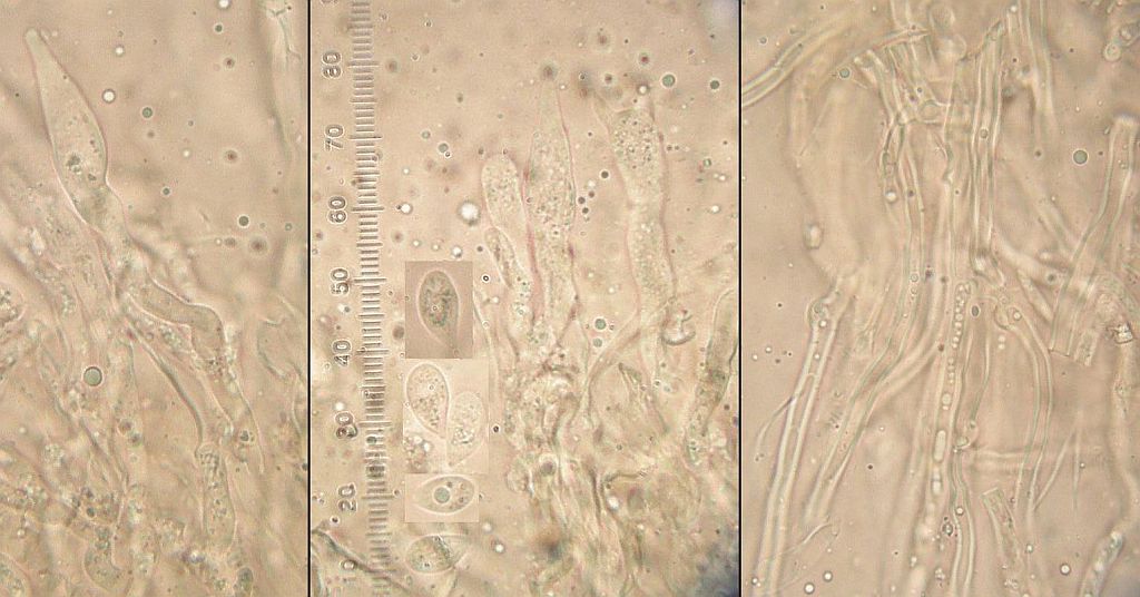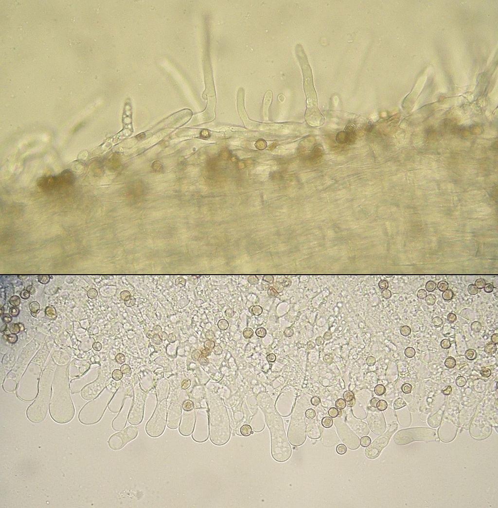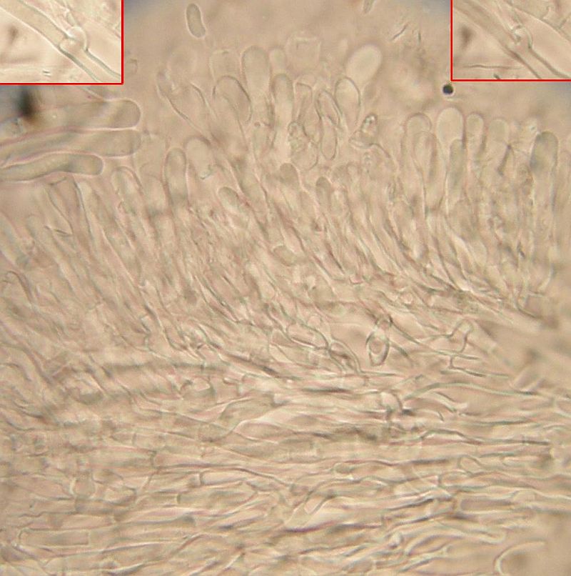 Sporen dürften klar sein (siehe Bild), Skeletthyphen fehlen, Schnallen vorhanden, keine zystidenartigen (dickwandigen), inkrustierten Elemente, die ins Hymenium ragen.