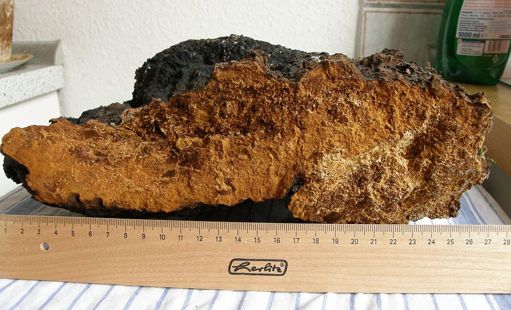 In bester Erntehöhe an einem Birkenstamm (ein dankbarer, beherzter Tritt und ab ist das Ding) sitzt ein ordentlicher Brocken der Anamorphe von Inonotus obliquus (Chaga, Schiefer Schillerporling):
