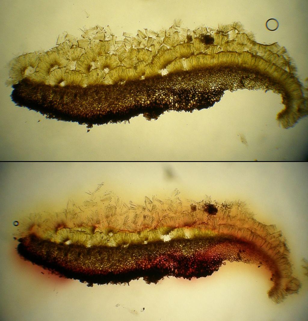 Was auf dem Mikrobild grün ist, muss man sich blau vorstellen. Mikroskopiert wurde in KOH, darin reagiert der blaue Farbstoff grün. In Wasser wäre alles, was auf dem Bild grün ist, dann natürlich blau. Bis auf die bräunlichen hyphen im Subikulum, die bleiben bräunlich.