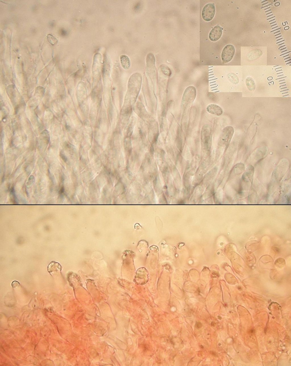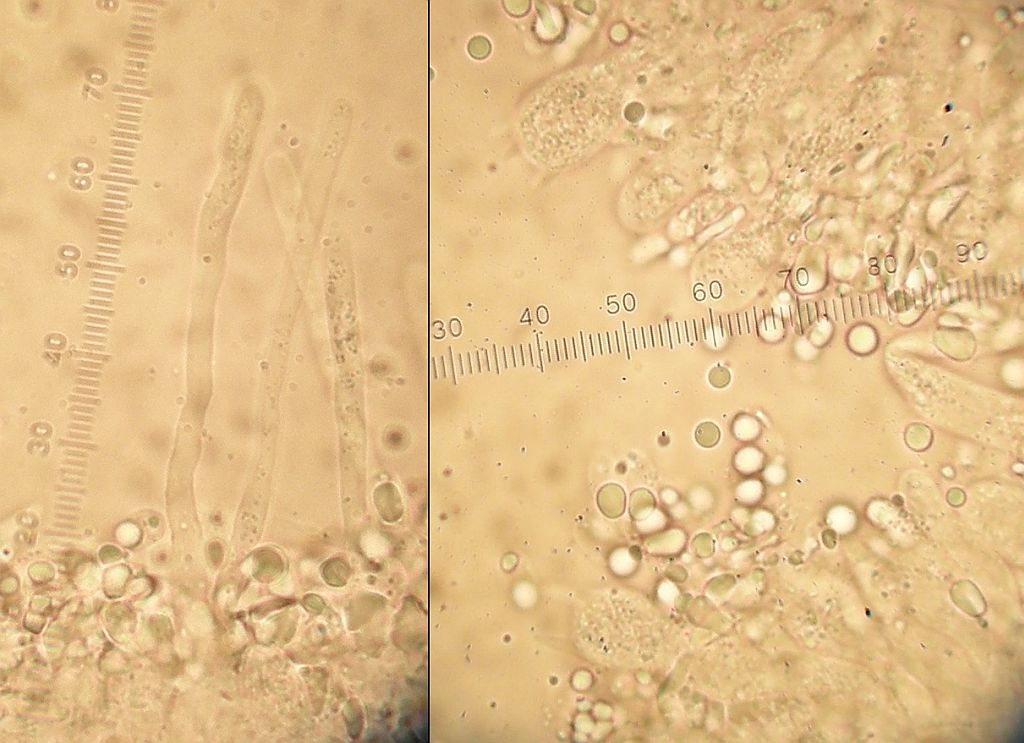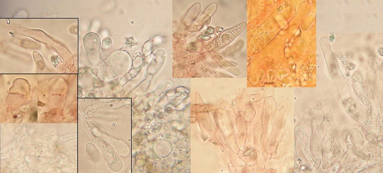 Basidien "stimmgabelförmig" (im Bild nur junge und unreife Basidien eingefangen); Die Sporen sollten normalerweise auch gelegentlich septiert sein, was hier nicht der Fall ist. Vielleicht noch nicht reif genug.