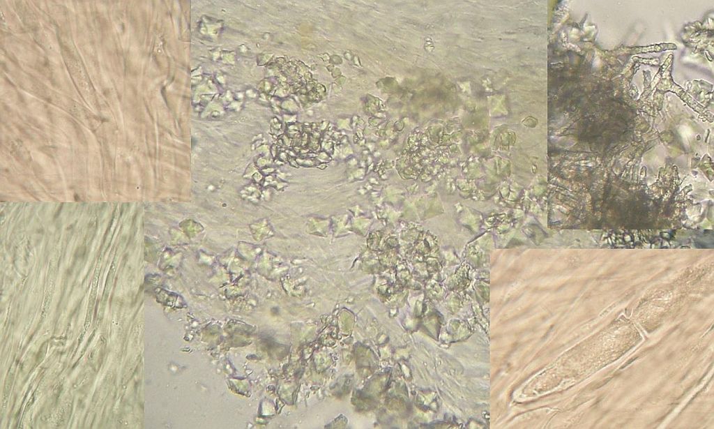 Die Kristalle lassen sich allerdings gut in den Rhizomorphen beobachten. Und da gibt es zwei Typen, was erstmal verwirrend ist. Die Hyphen sind fast durchgehend inkrustiert mit kleinen, anfangs stäbchenförmigen, dann zu dickeren Konglomeraten zusammenklumpenden Kristallen. Die sind aber - so wie ich das verstehe - nicht bestimmungsrelevant. Im Subikulum und den Rhizomorphen finden sich zwischen den Hyphen zusätzlich noch größere bipyramidale Kristalle, und die sind gesucht. Allerdings sind die nicht einfach zu finden.
