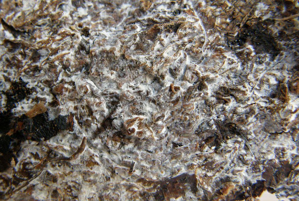Also mal angenommen, man findet mal heraus, daß das in die Gattung Trechsipora gehört, dann geht man auf Franks Seite zu den >Downloads<, klickt auf "die Gattung Trechispora" und zerbricht sich die nächsten Stunden den Kopf über diverse Kristallformen, Hyphenbreiten und die Frage, wo hier das Hymenium beginnt und das Subikulum endet.