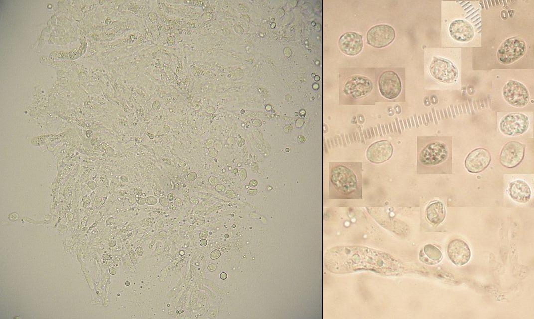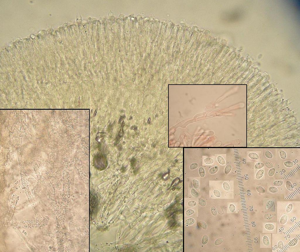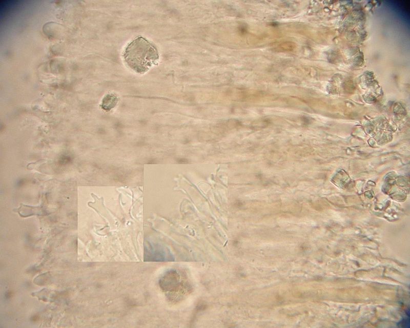 Sporen dürften klar sein (siehe Bild), Skeletthyphen fehlen, Schnallen vorhanden, keine zystidenartigen (dickwandigen), inkrustierten Elemente, die ins Hymenium ragen.