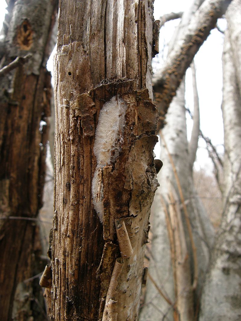 An einem noch stehenden, toten Haselstämmchen findet sich mit Trechispora candidissima (weißflauschiger Stachelsporling, deutscher Name eben selbst erfunden) ein besonders hübsches Pilzchen: