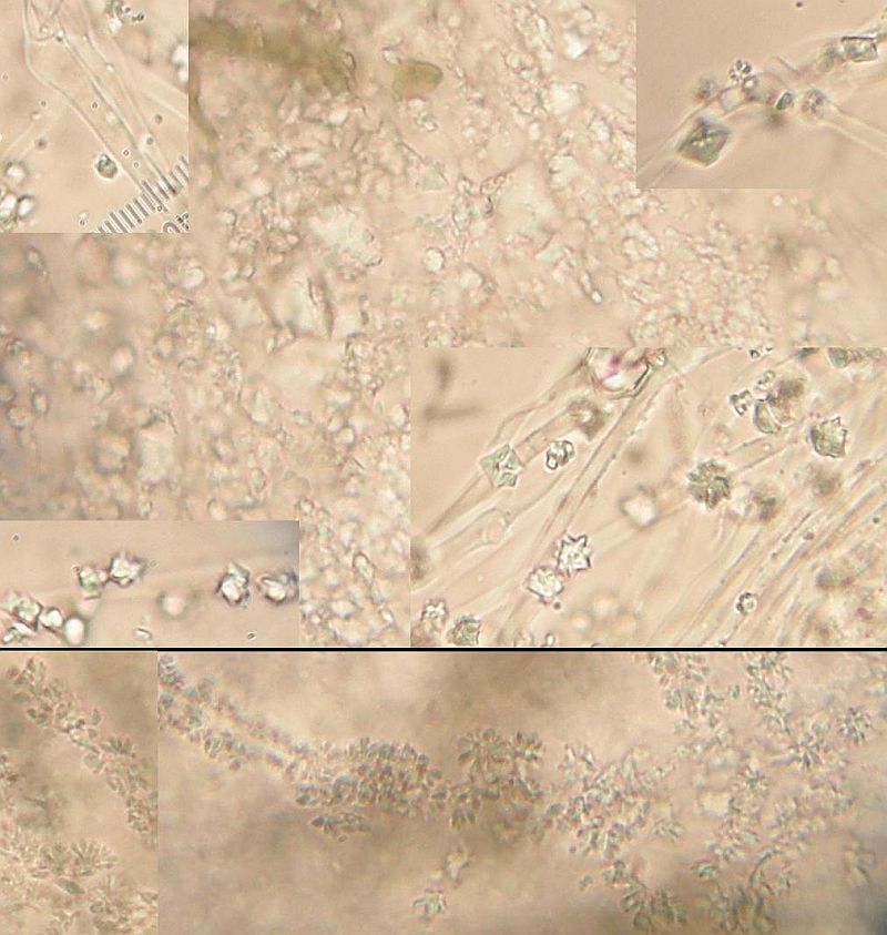 Die Kristalle lassen sich allerdings gut in den Rhizomorphen beobachten. Und da gibt es zwei Typen, was erstmal verwirrend ist. Die Hyphen sind fast durchgehend inkrustiert mit kleinen, anfangs stäbchenförmigen, dann zu dickeren Konglomeraten zusammenklumpenden Kristallen. Die sind aber - so wie ich das verstehe - nicht bestimmungsrelevant. Im Subikulum und den Rhizomorphen finden sich zwischen den Hyphen zusätzlich noch größere bipyramidale Kristalle, und die sind gesucht. Allerdings sind die nicht einfach zu finden.