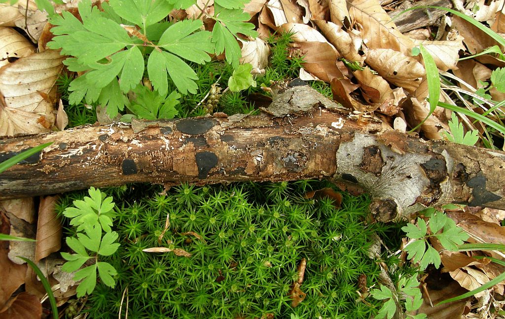 An dünnen, liegenden Laubholzzweiglein sitzt Hymenochaete corrugata (Gefelderte Borstenscheibe):