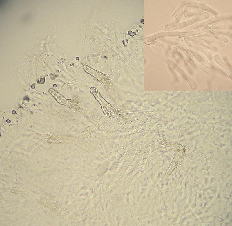 Die rotbraun pigmentierten "Safthyphen" setzen sich im Hymenium als pigmentierte, etwas dickwandige Pseudozystiden fort.
