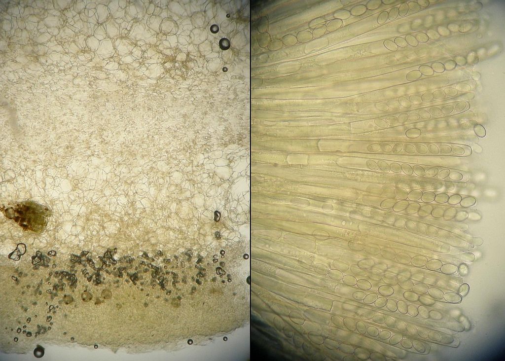 Was auf dem Mikrobild grün ist, muss man sich blau vorstellen. Mikroskopiert wurde in KOH, darin reagiert der blaue Farbstoff grün. In Wasser wäre alles, was auf dem Bild grün ist, dann natürlich blau. Bis auf die bräunlichen hyphen im Subikulum, die bleiben bräunlich.