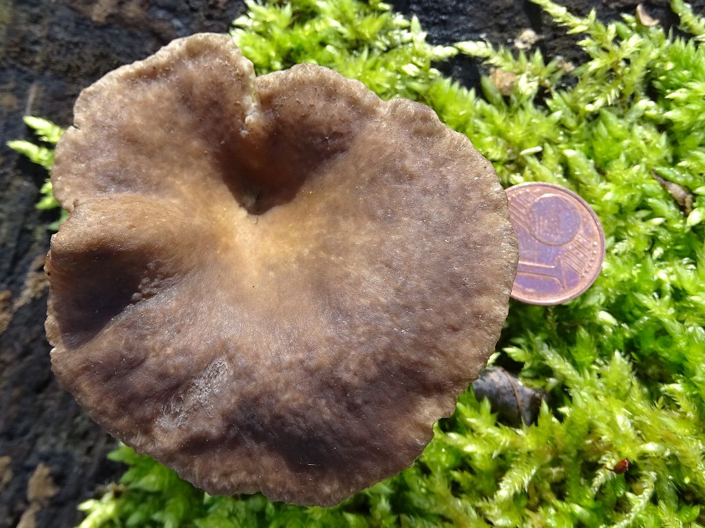 Wahrscheinlich gibt das Susbtrat nicht mehr genug Nährstoffe her, dan hat man dann einen Hungerfruchtkörper, wozu auch die Lamellen passen. Im Größenvergleich (Münze) passt das nämlich auch wieder, nur ist der Fruchtkörper halt insgesamt recht klein.