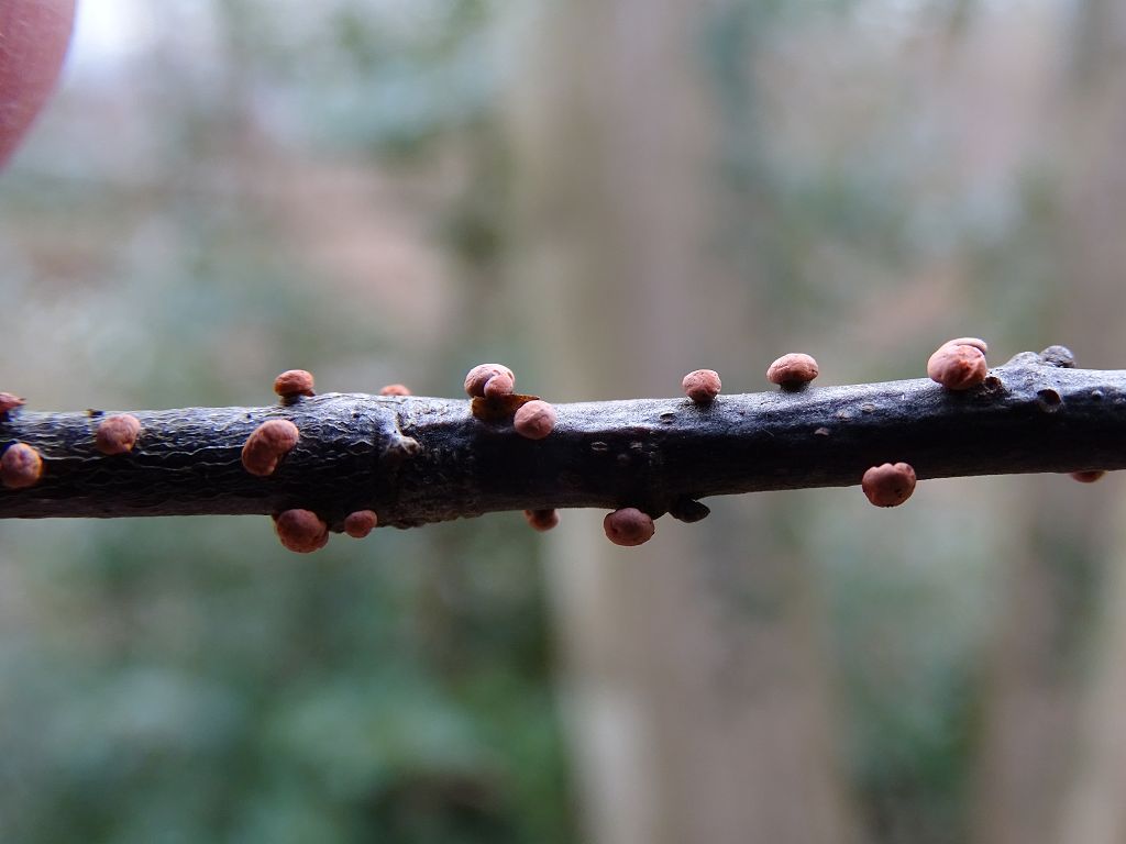 Substrat: ca. 50 locker verteilte Exemplare an dünnem (ca. 5 mm Durchmesser) totem Laubholz-Zweig